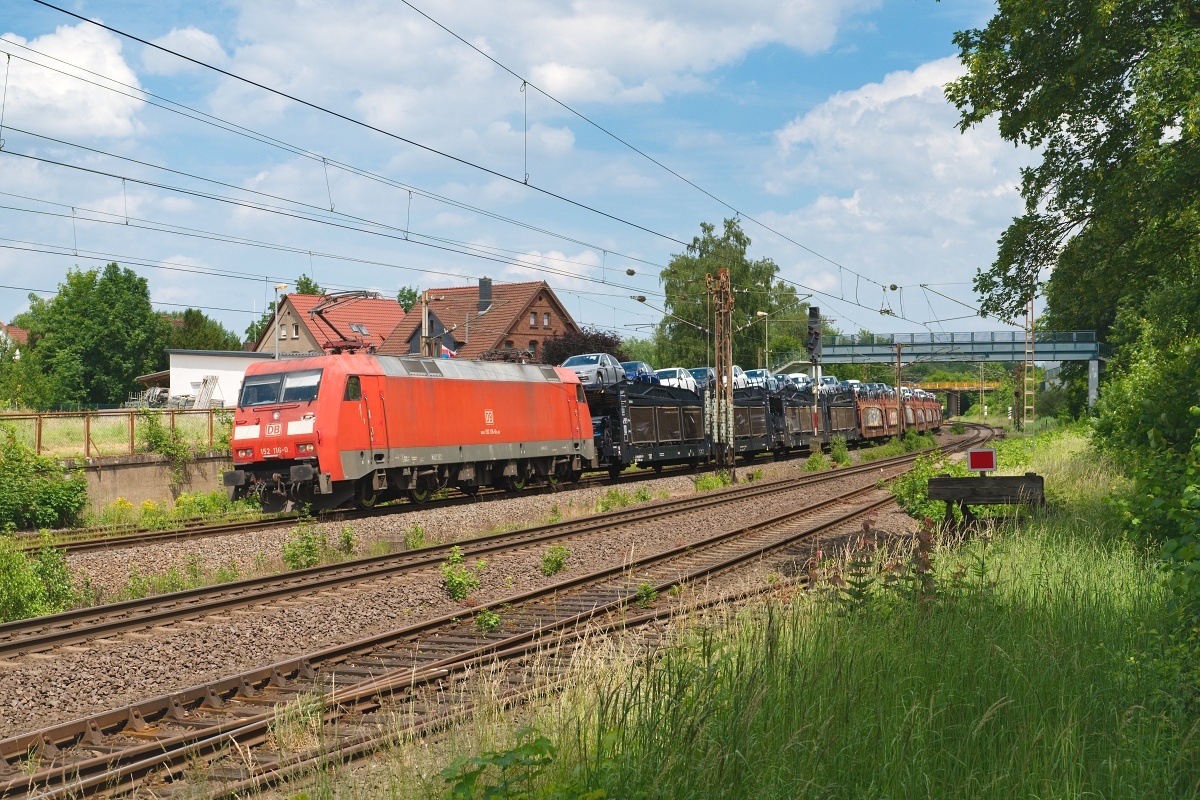 Dto. 152 112-9 am 06.04.2023 bei Eilvese (HEIV) mit einem Stahlzug Rtg.