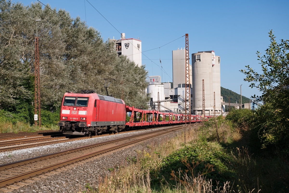 morgens am 24.08.2024 bei Karlstadt (NKA) mit einem Leerautozug Rtg. Süden/Würzburg (NWH)...