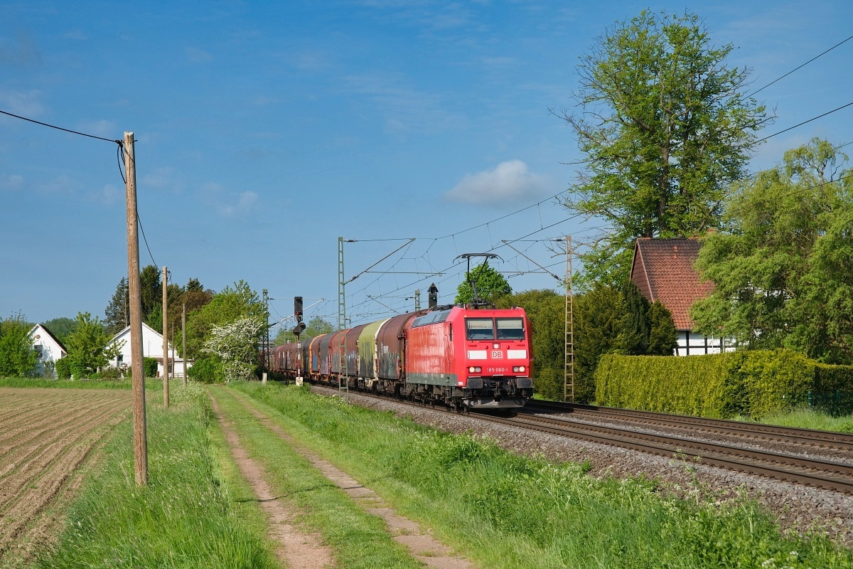 Dto. 185 060-1 früh morgens am 03.05.2025 bei Lindhorst (HLH) mit einem EZ