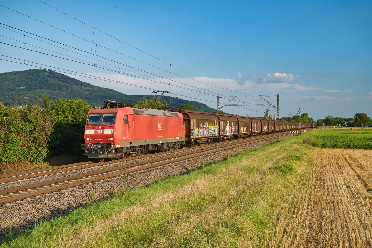 185 089-0 war hier am 16.08.2023 bei Gambach im Maintal mit 185 257-3 und