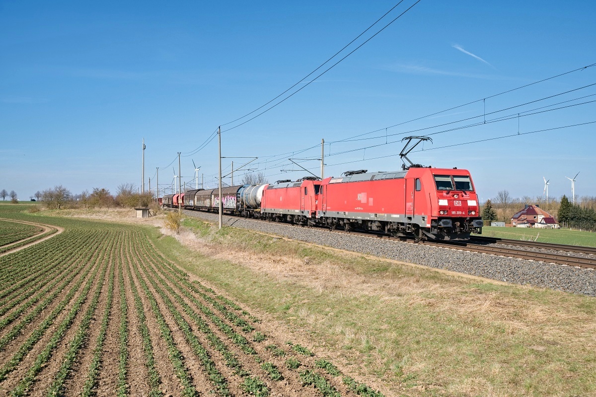 Dto. 185 209-4 am 20.03.2025 bei Ovelgünne (LOV) mit Wagenlok 185 391-0