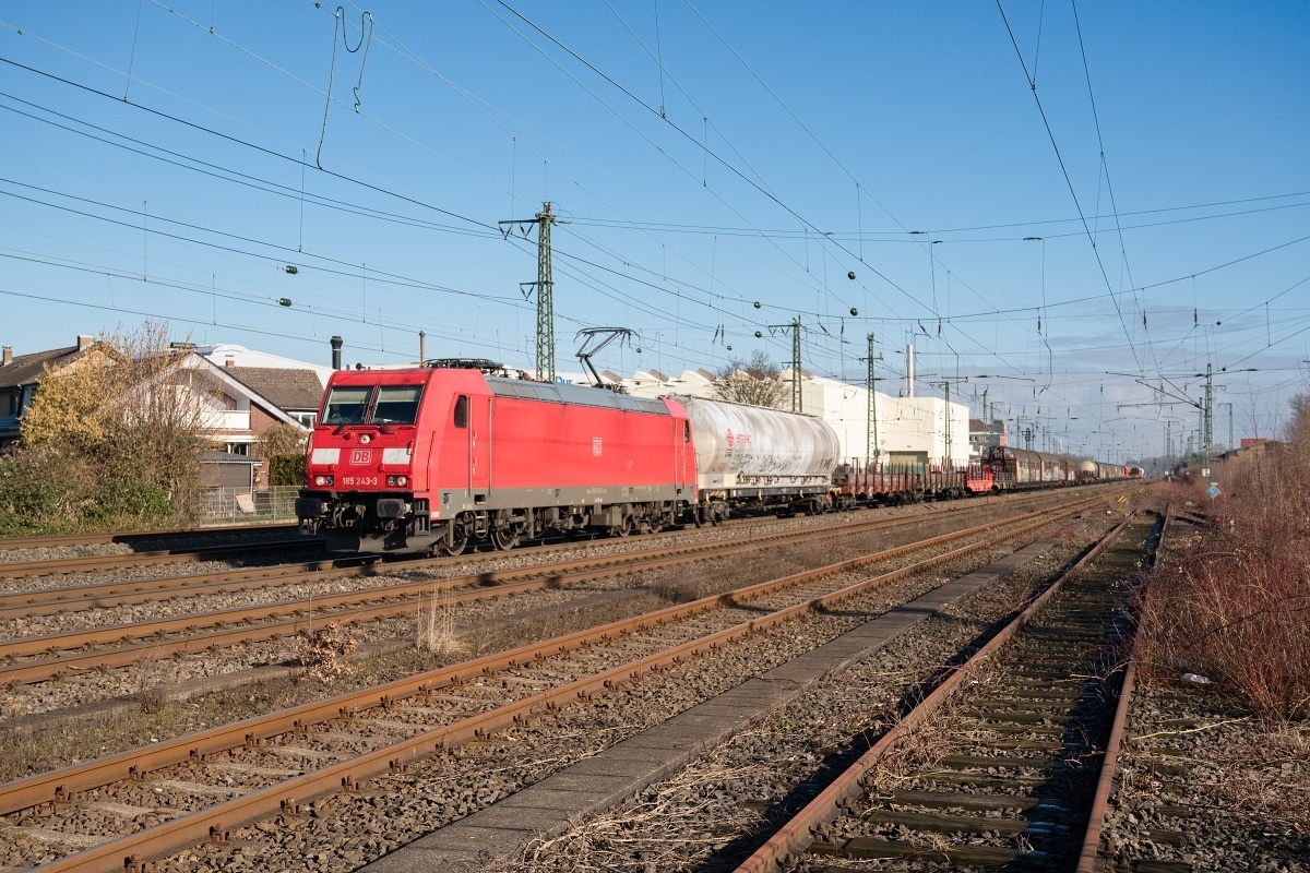 Dto. 185 243-3 am 01.02.2025 im Bf Oelde (EOEL) mit einem EZ Rtg.