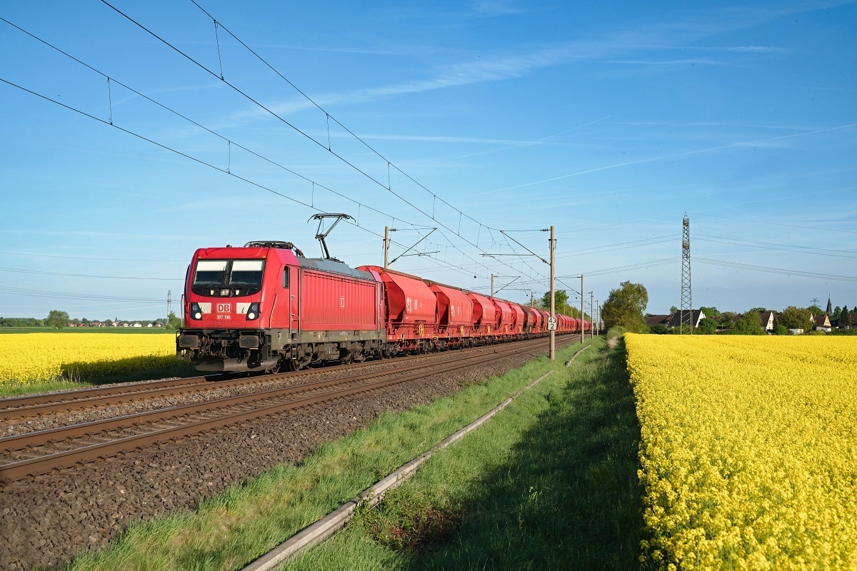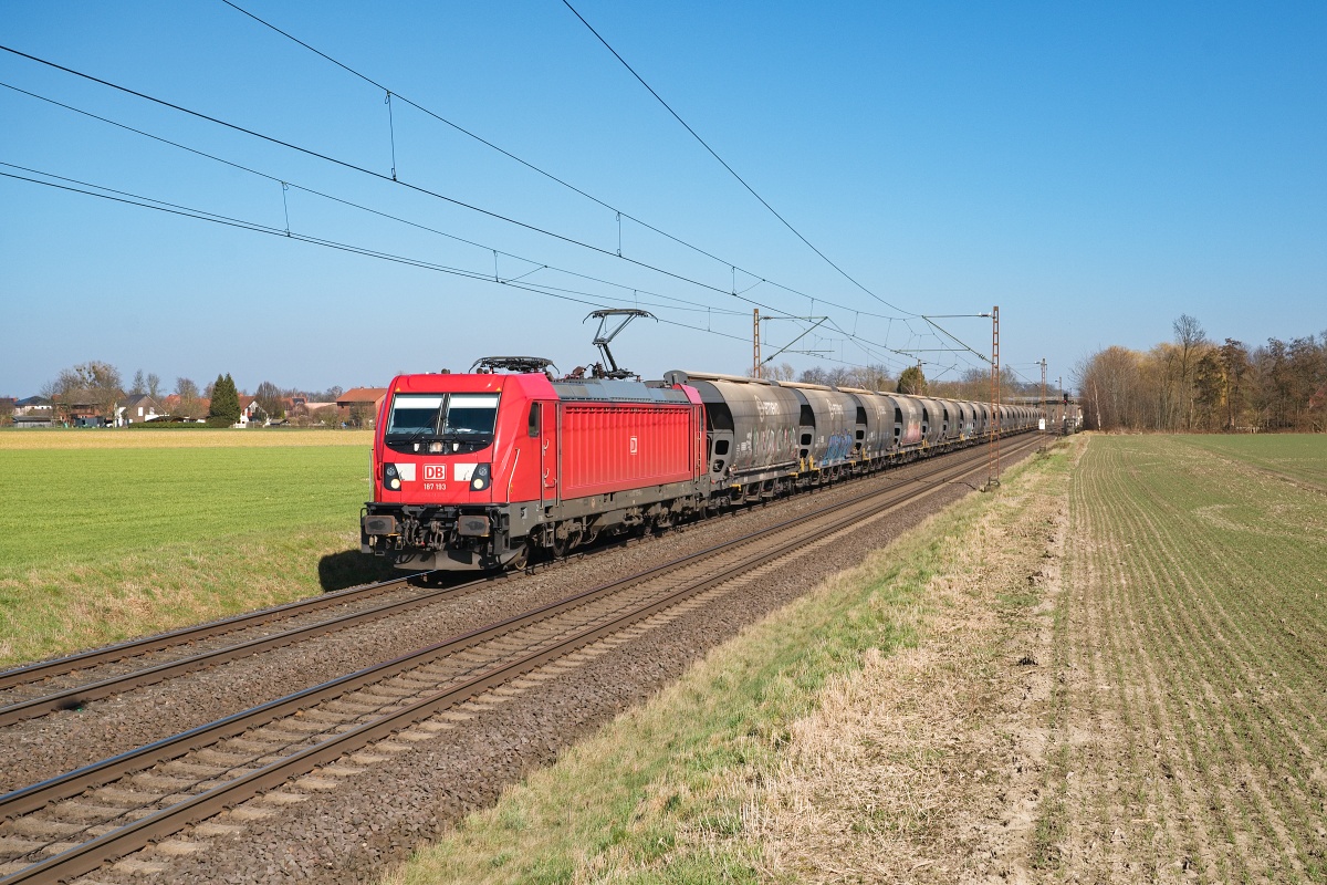 Dto. 187 193-8 am 06.03.2025 bei Kirchhorsten (HKHN) mit Getreidewagen Rtg.