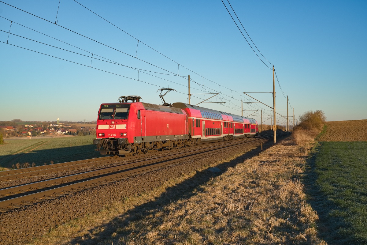 Dto. 146 019-5 kurz nach Sonnenaufgang am 19.03.2025 bei Eilsleben (LEI) mit