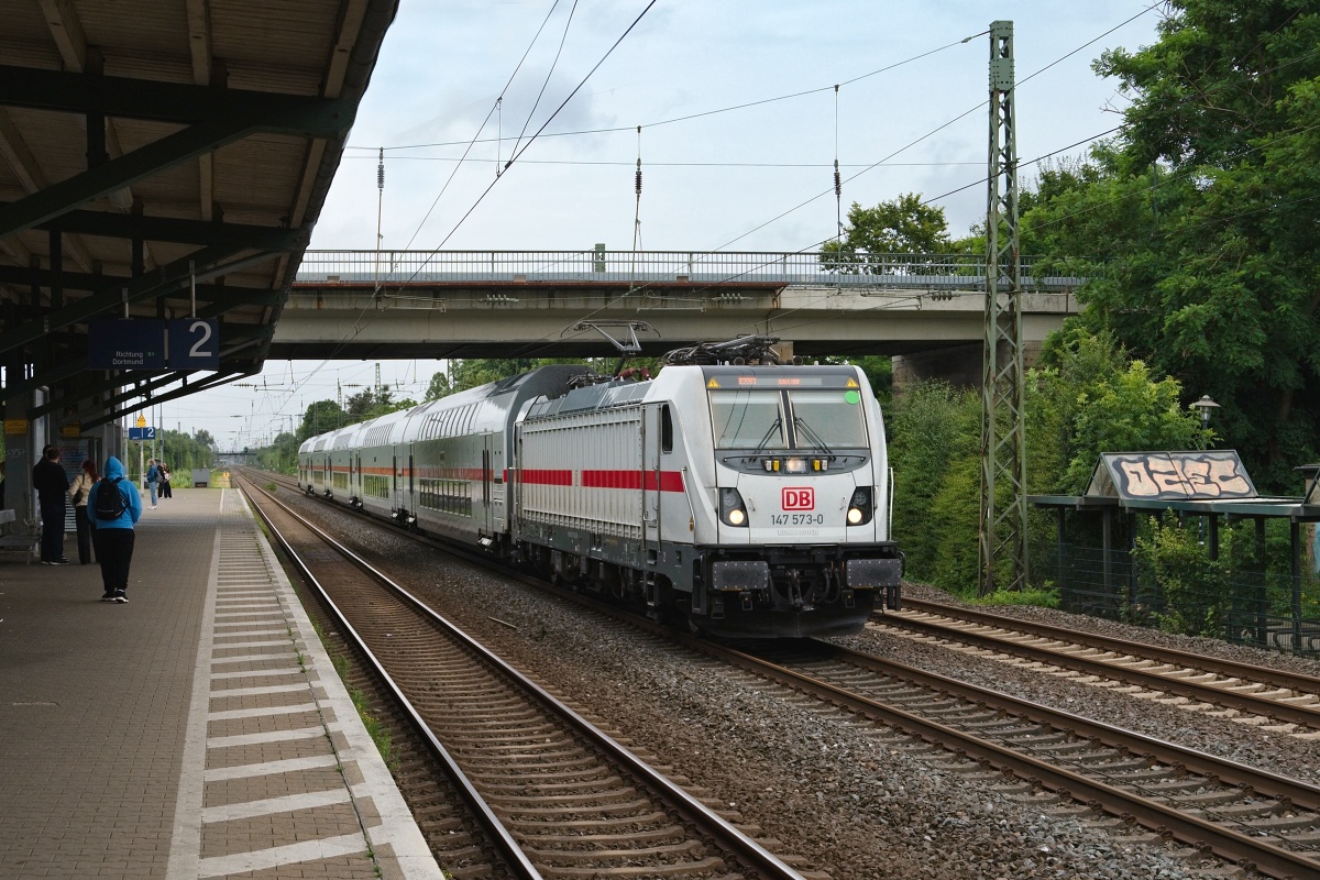 Dto. 147 573-0 am 05.07.2024 beim Haltepunkt Angermund (KANM) mit dem IC