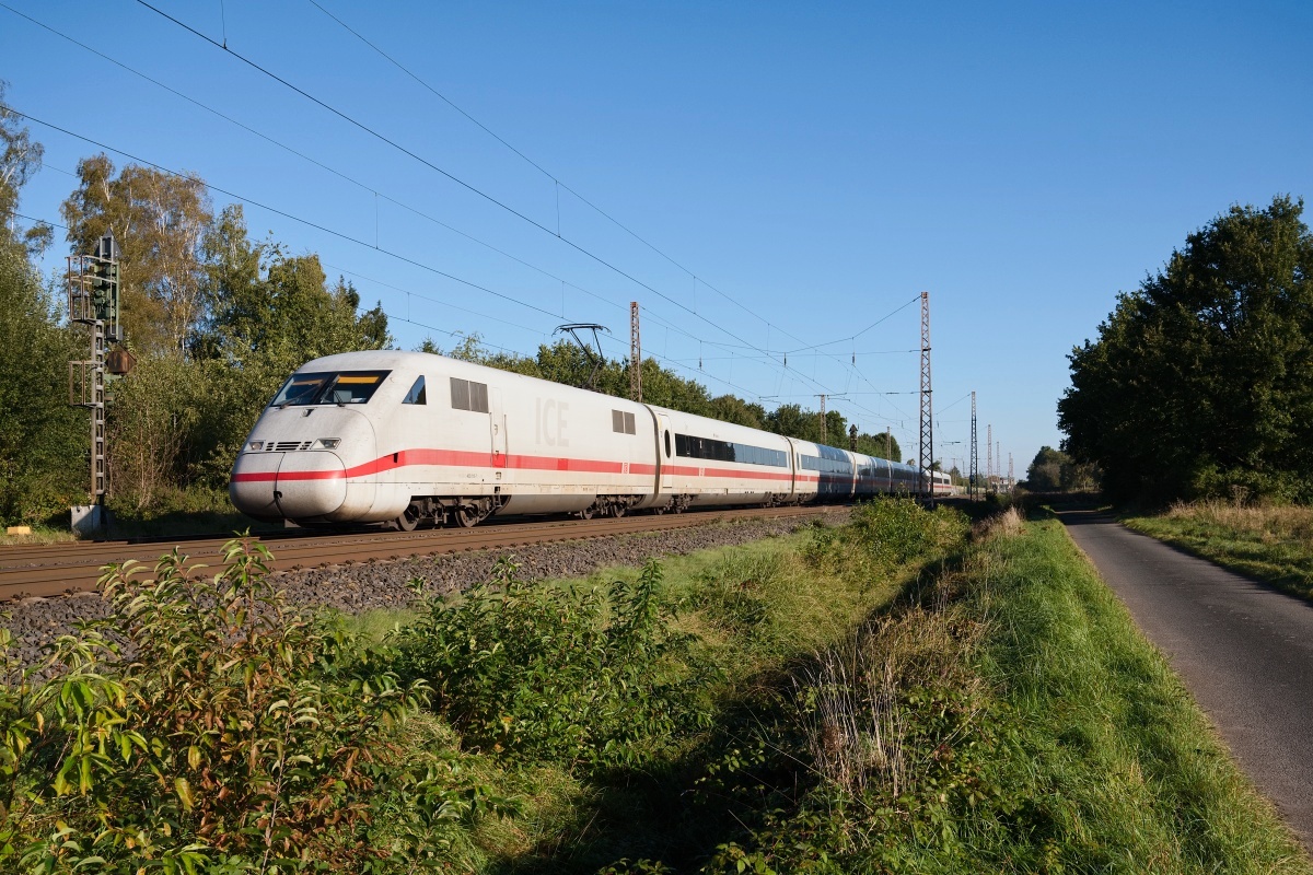 der Morgensonne bei Eilvese (HEIV) als ICE 533 von Oldenburg Hbf nach