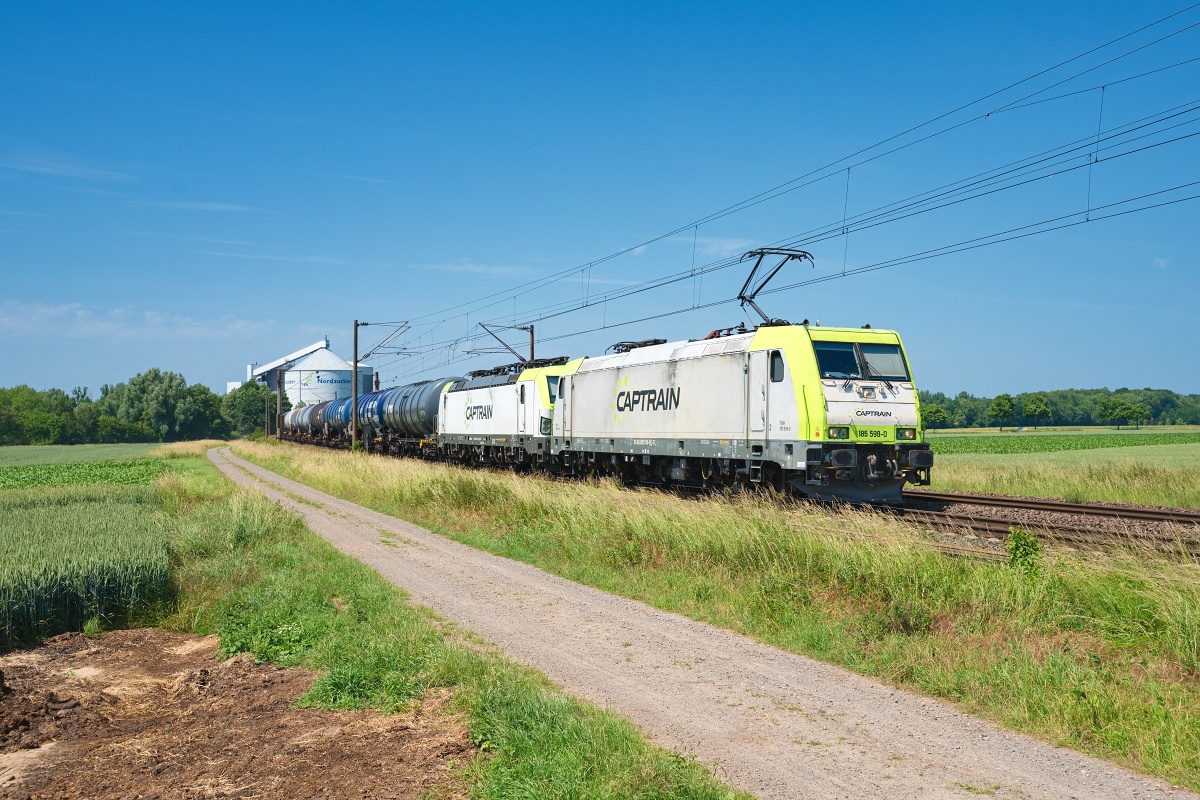 Dto. 185 598-0 am 02.06.2021 bei Bückeburg (HBKB) Evesen mit Kesselwagen in