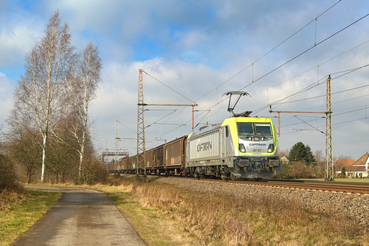 Dto. 187 014-6 am 25.03.2020 mit richtigem Licht und frisch gewaschen. Hier war die Lok bei Bückeburg (HBKB)