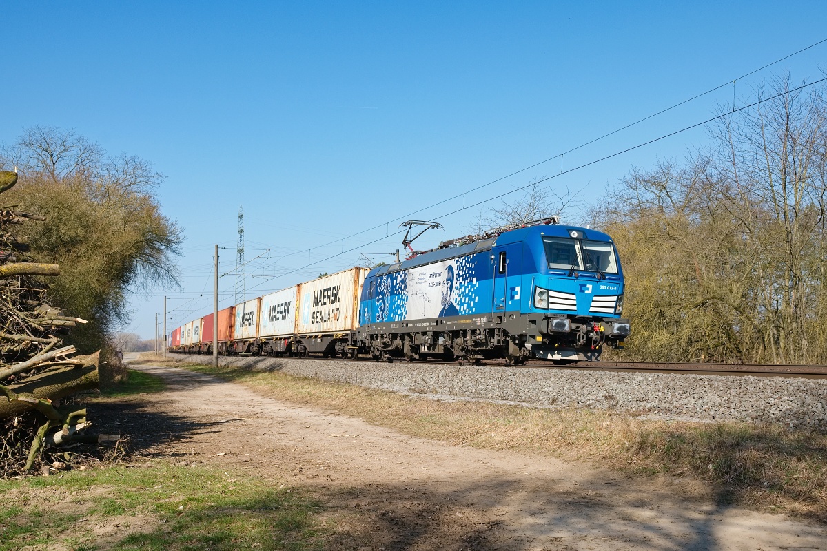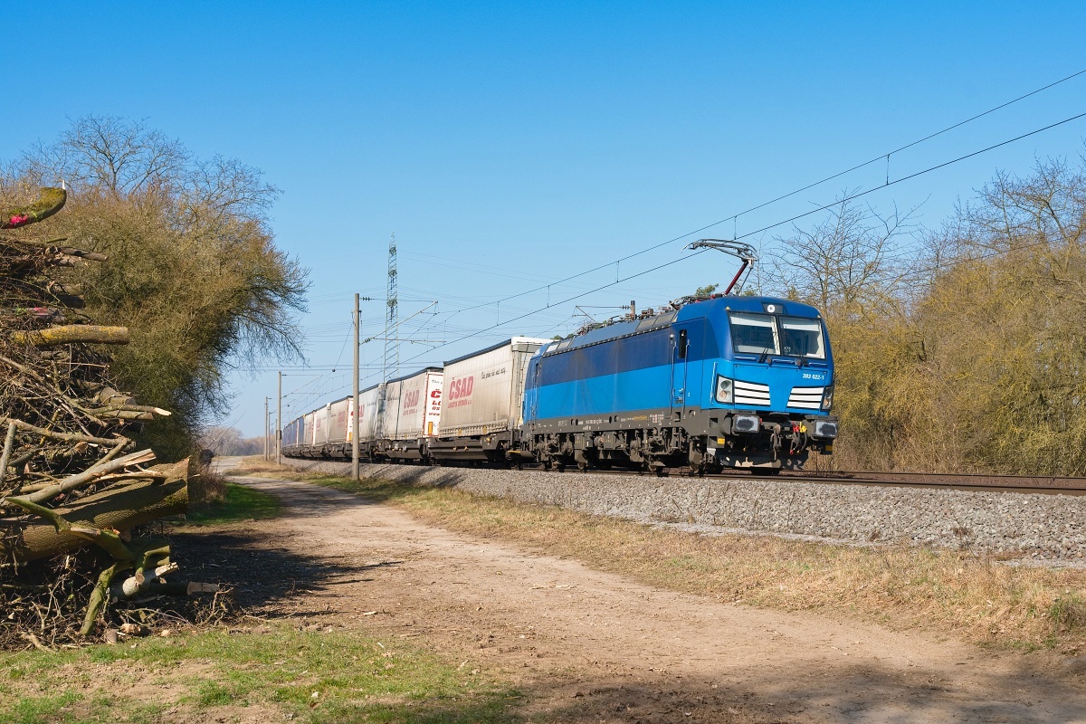 Dto. 383 022-1 am 21.03.2025 bei Wierthe (HWIR) mit dem Lovosice KLV DGS