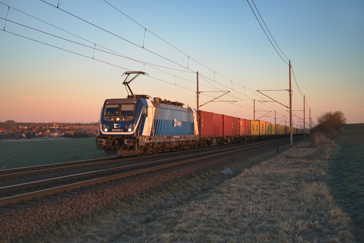Dto. 388 009-3 zum Sonnenaufgang am 18.03.2025 bei Eilsleben (LEI) mit einem