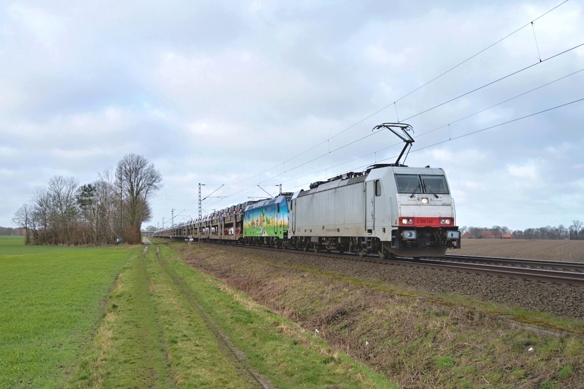 war hier am 26.02.2022 bei Lindhorst (HLH) mit Wagenlok 186 642-6 "Ecorider"