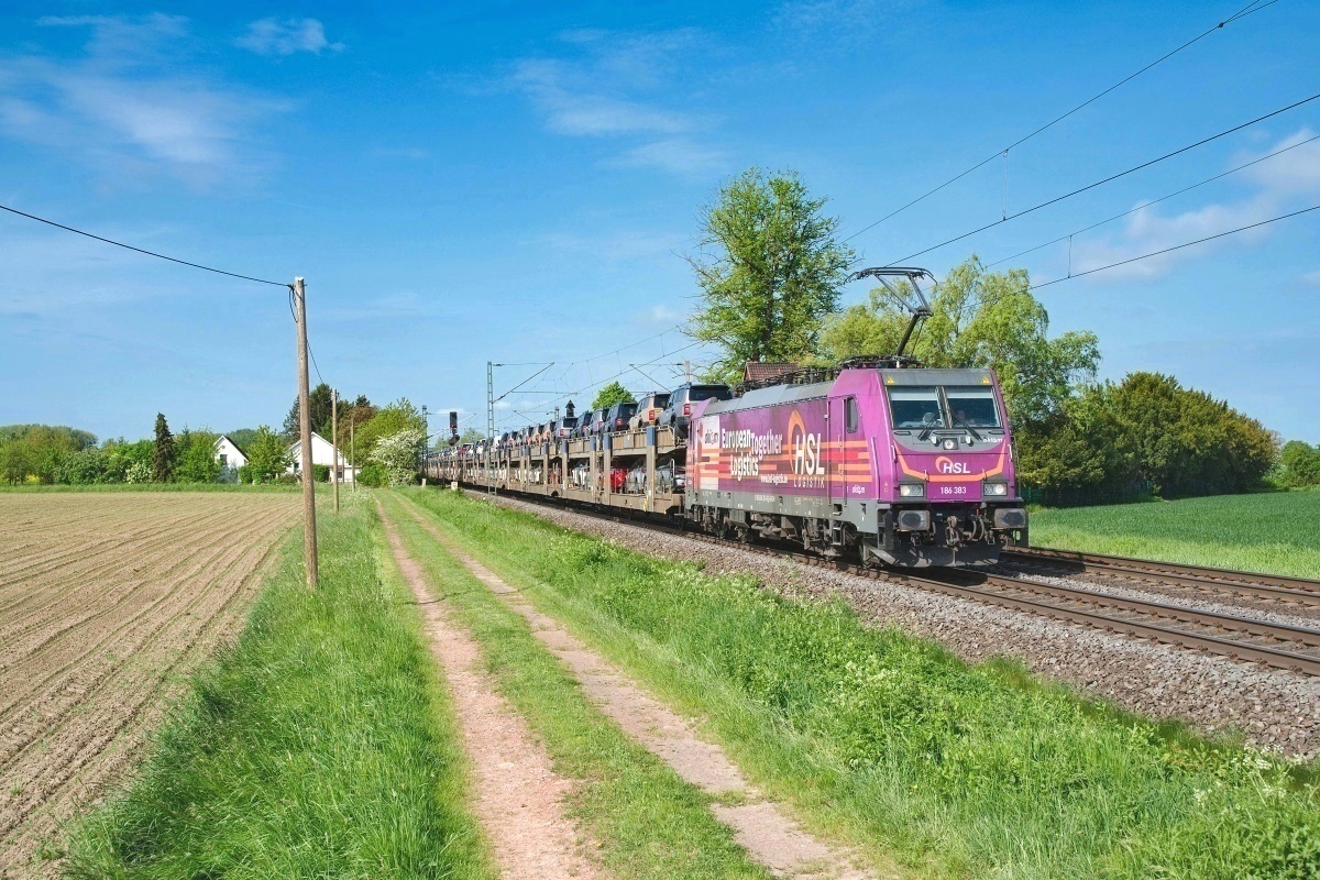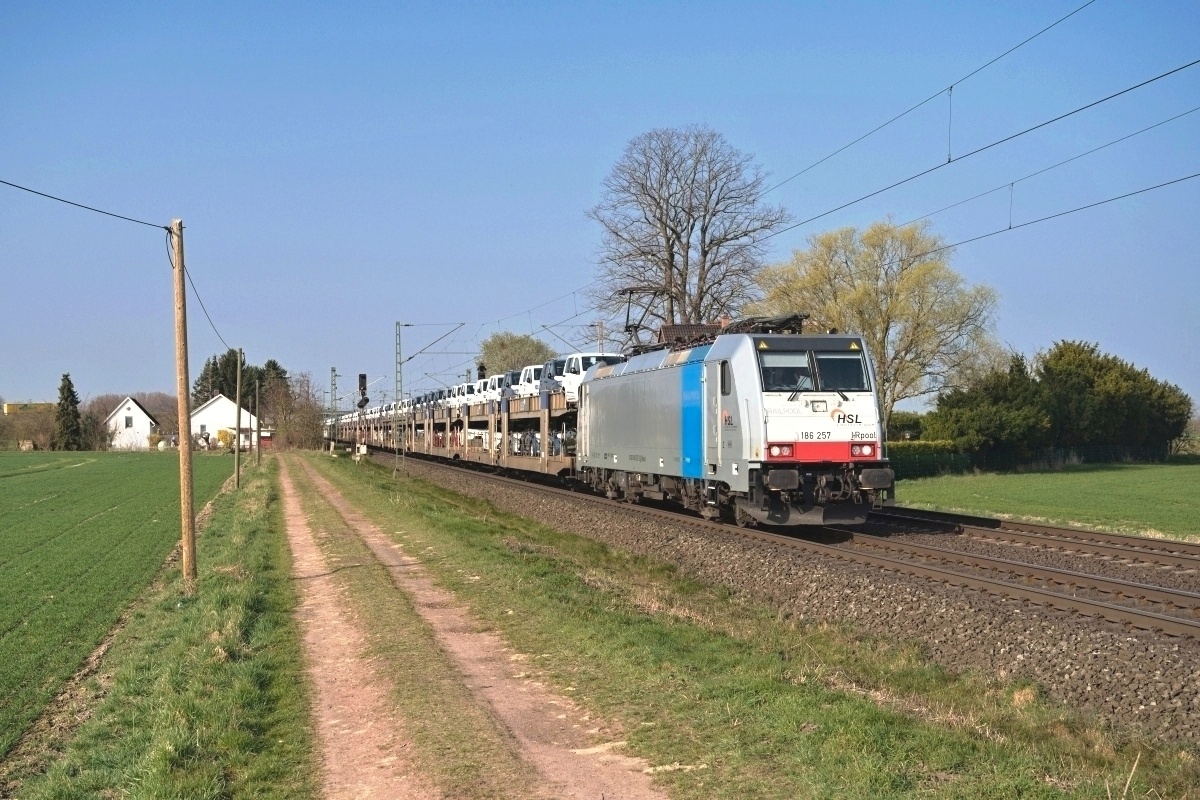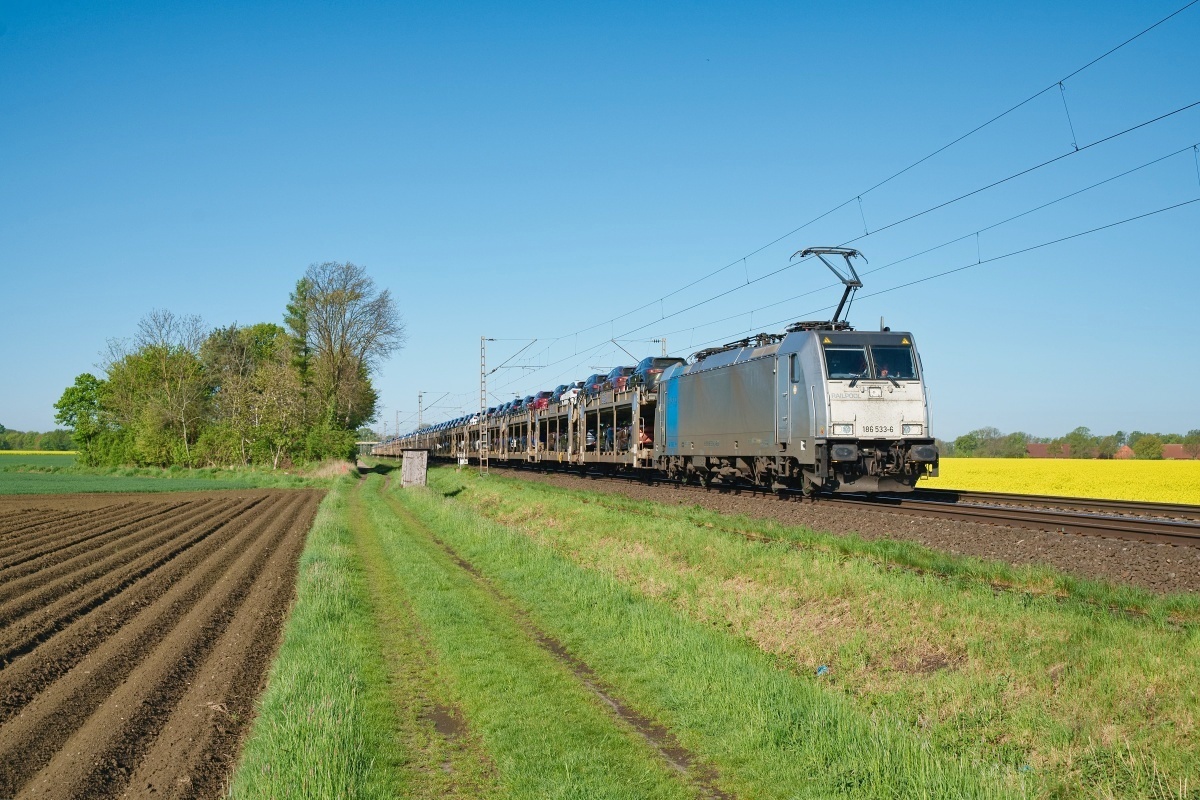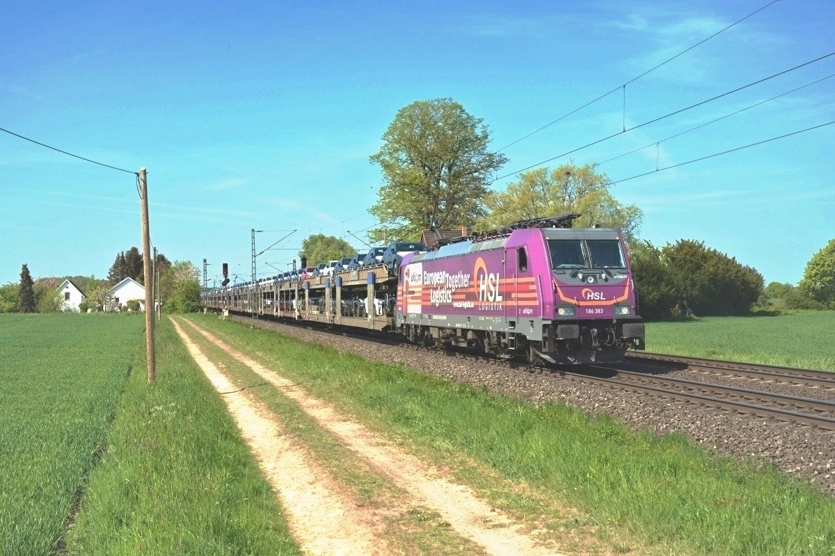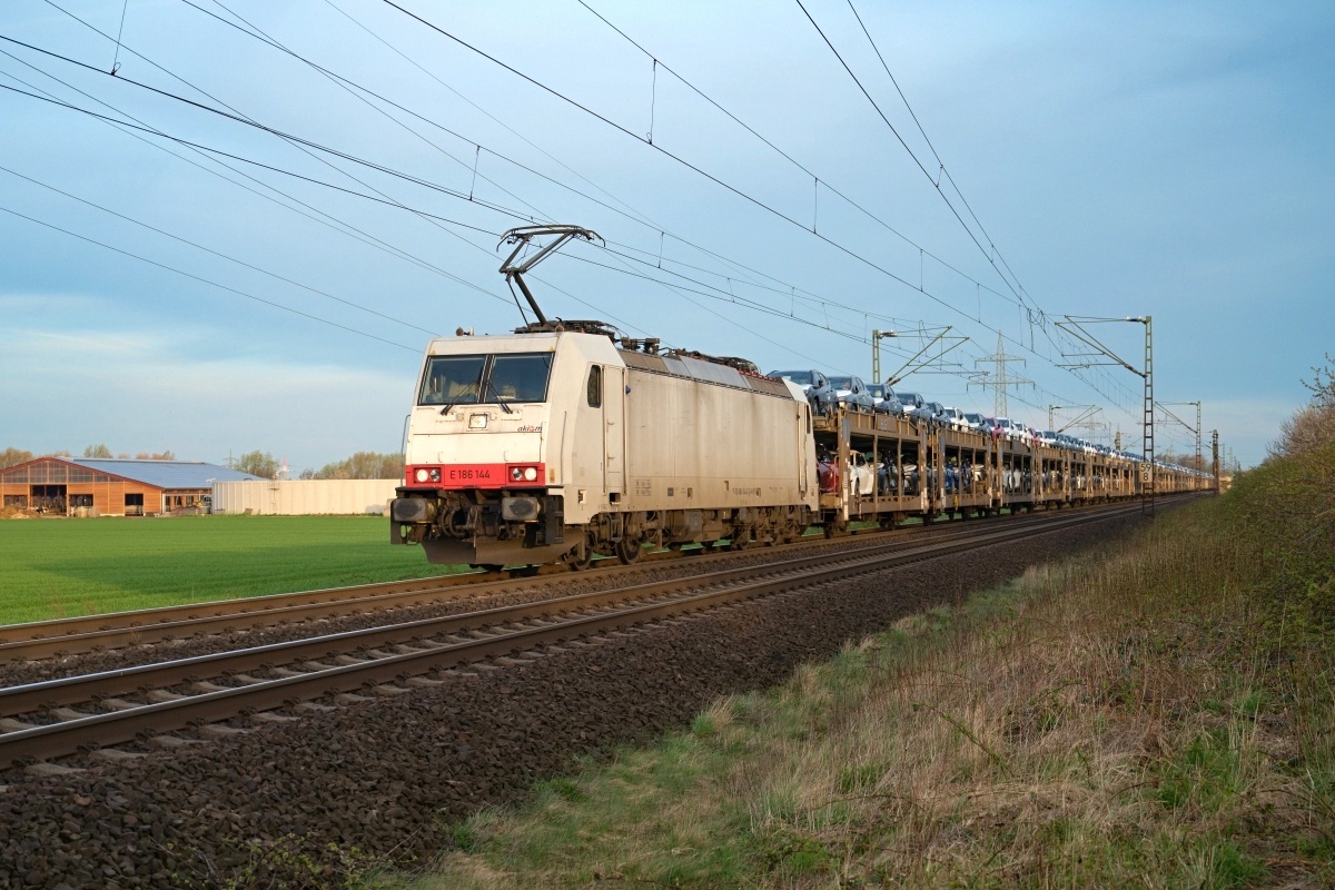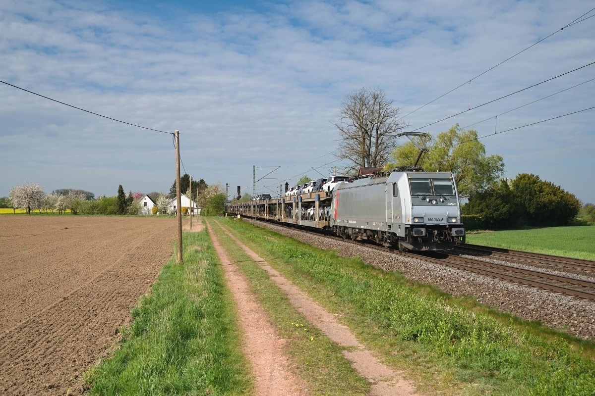 Dto. 186 363-8 am 15.04.2025 bei Stadthagen (HSHG) mit einem BLG Autozug