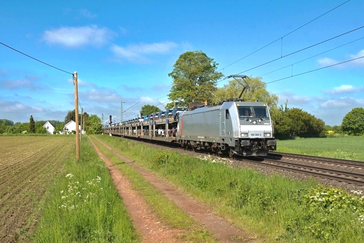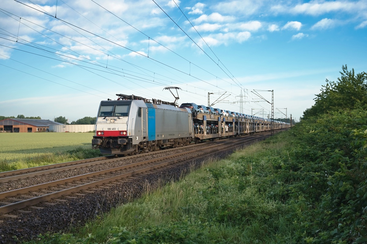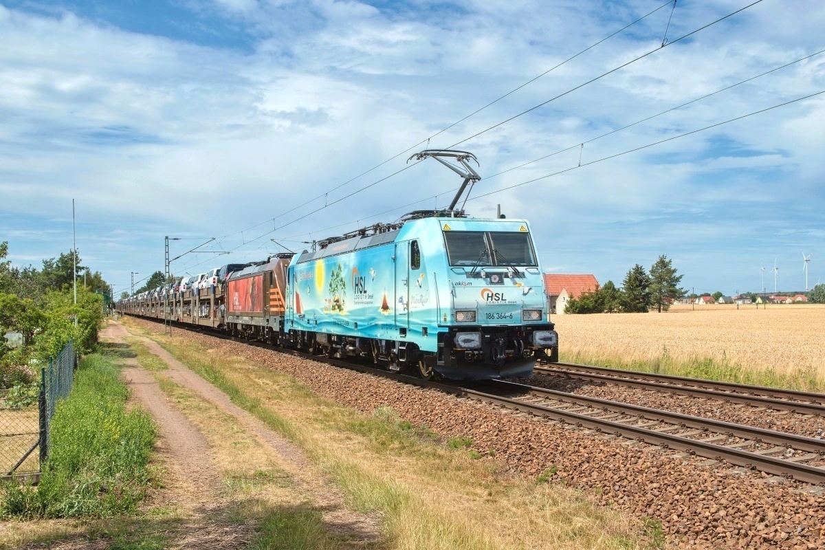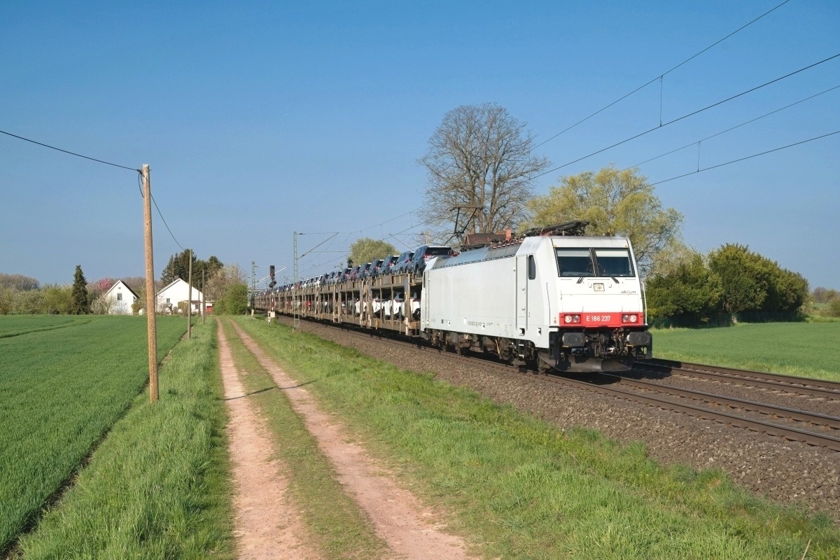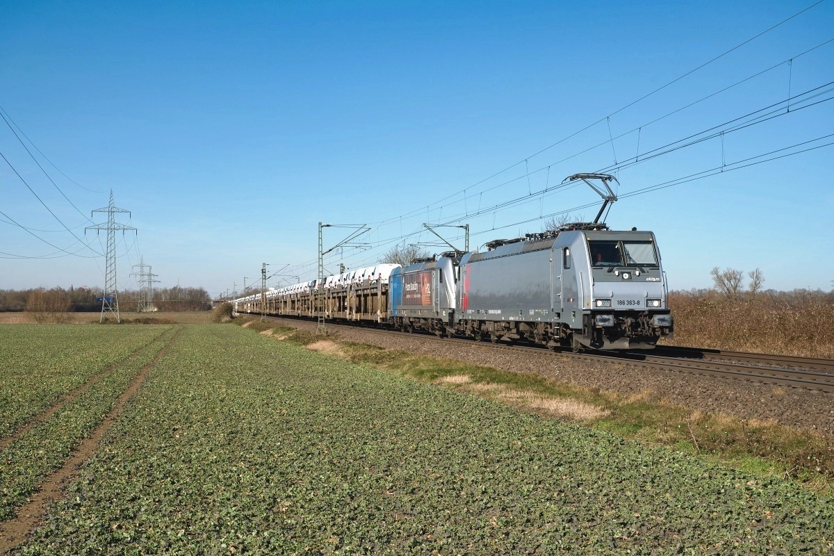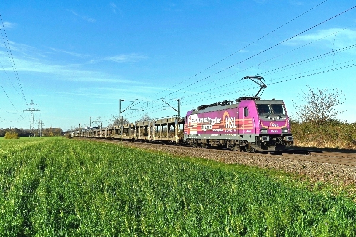 Dto. 186 363-8 am 15.04.2025 bei Stadthagen (HSHG) mit einem BLG Autozug