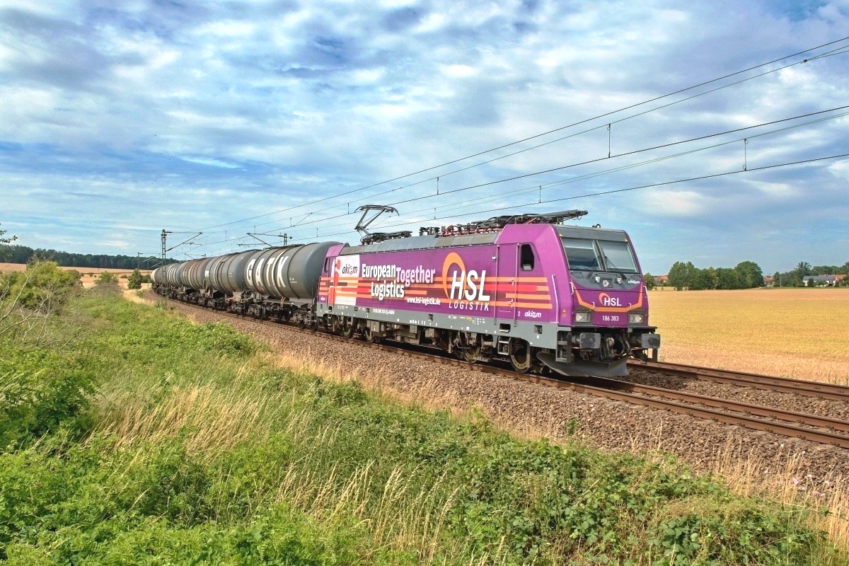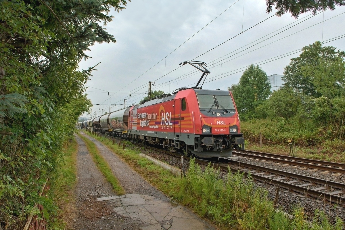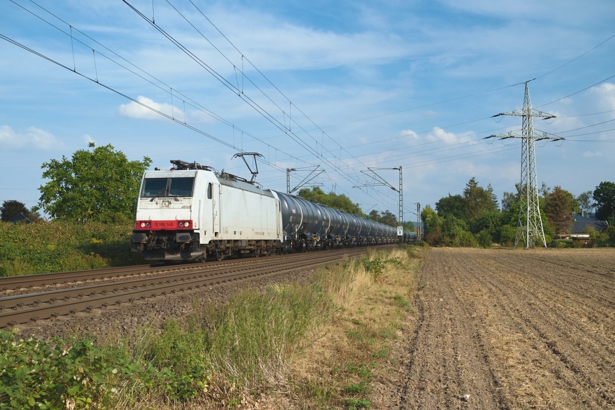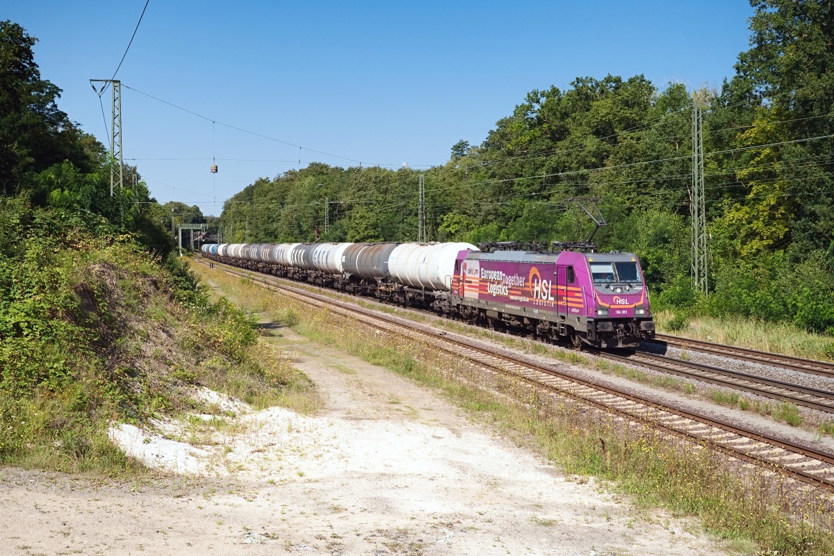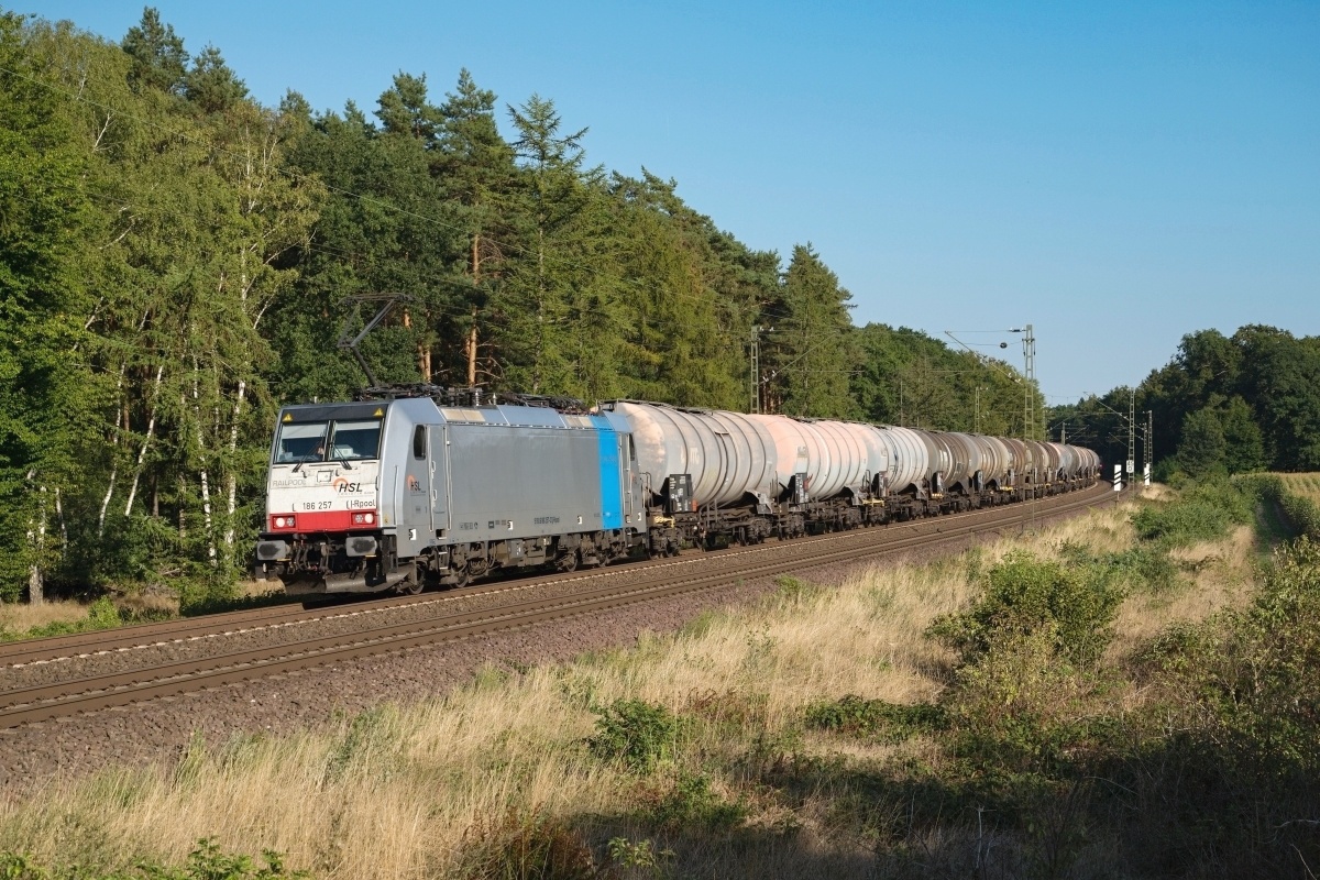 Dto. 186 257-2 am 24.08.2022 bei Linsburg (HLBU) mit einem Kesselwagenzug