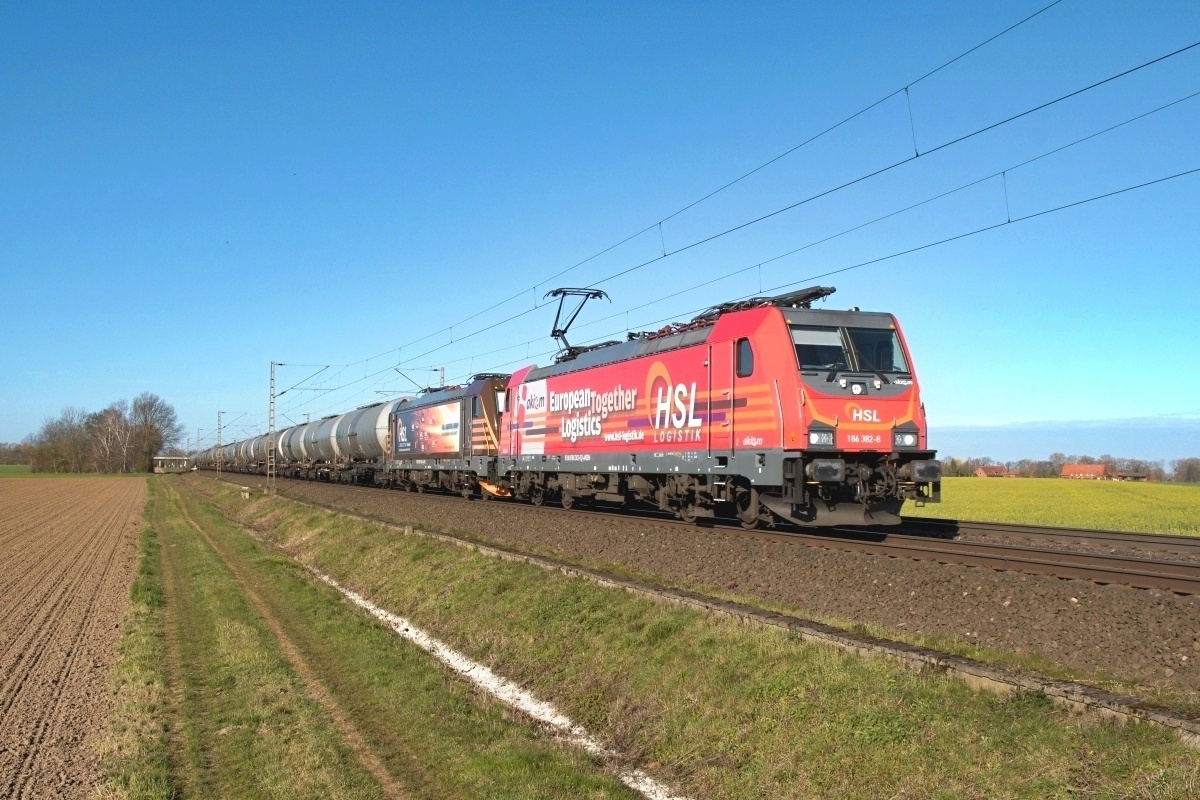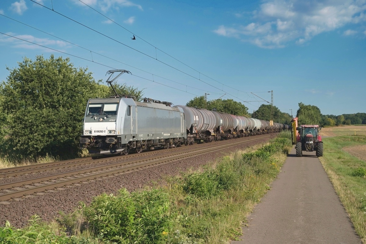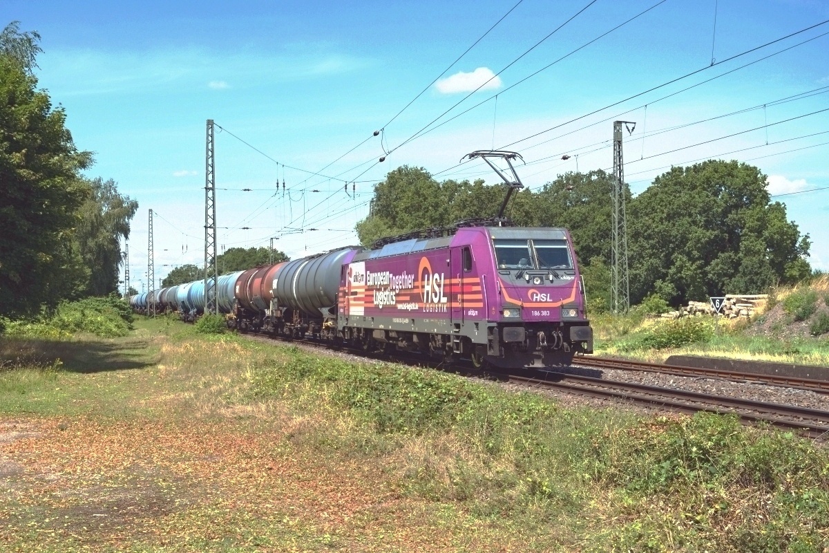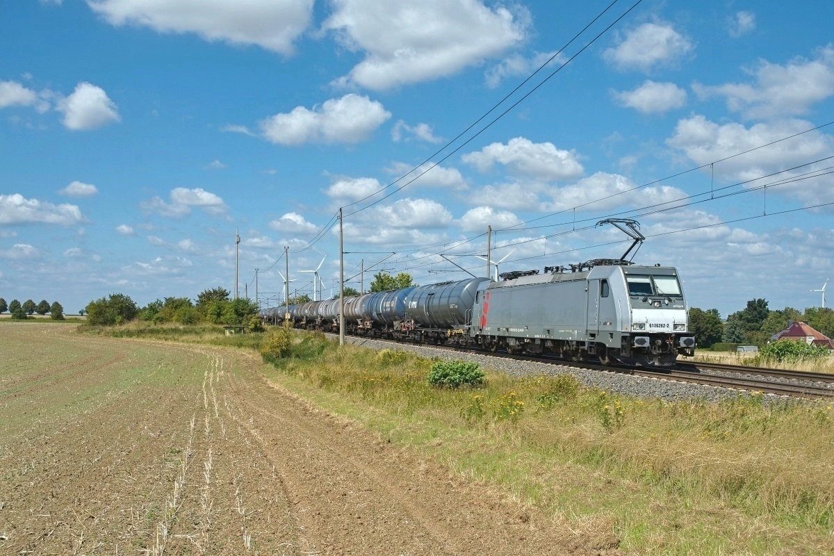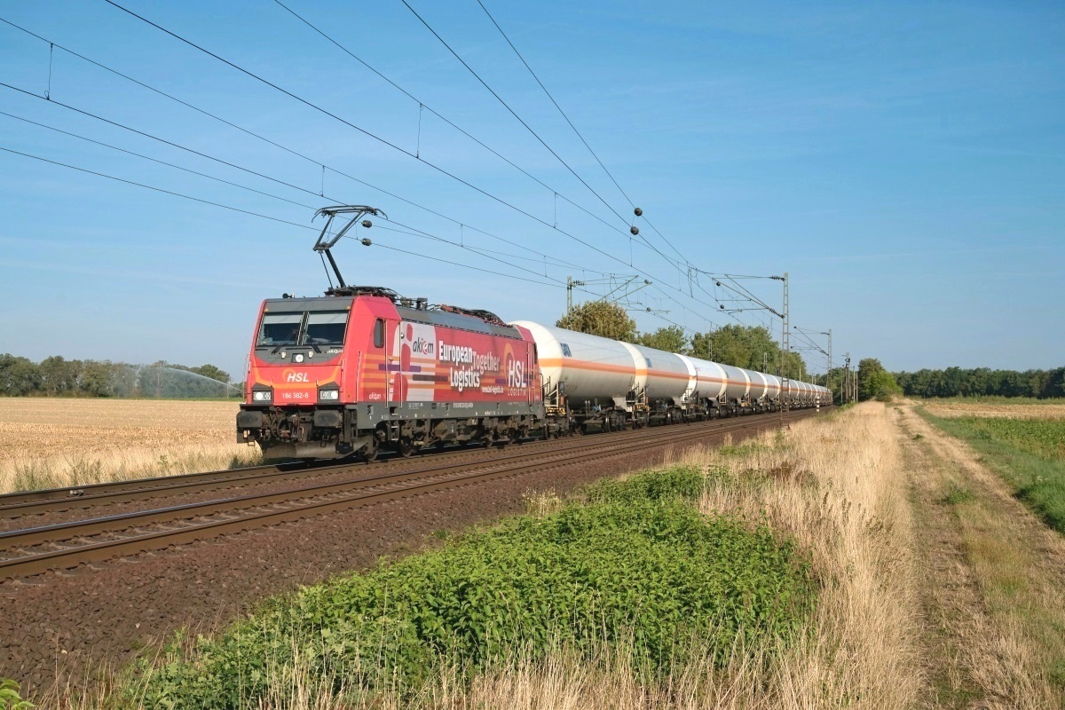 Dto. 186 262-2 am 10.08.2025 bei Ovelgünne (LOV) mit Kesselwagen Rtg.