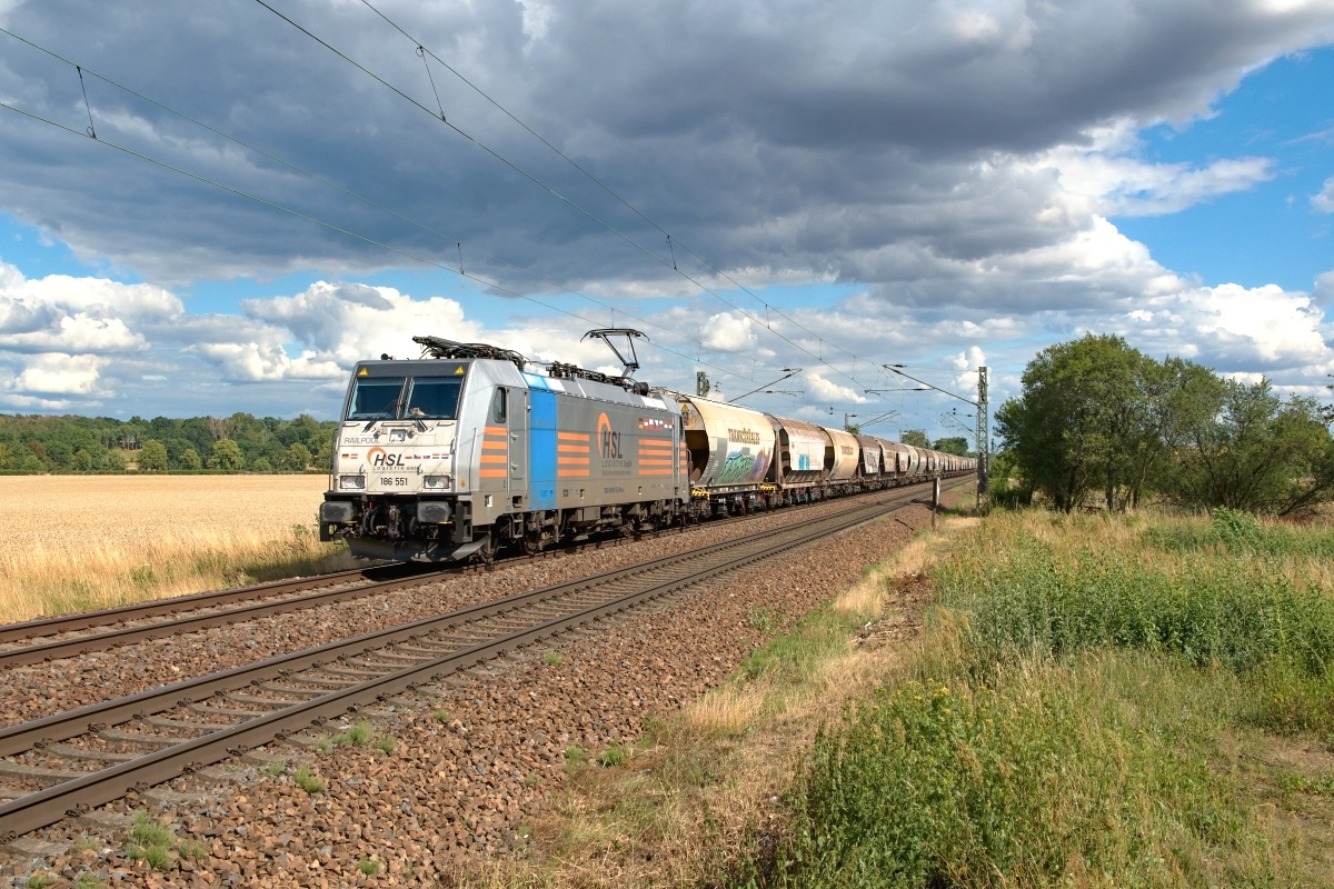 Dto. 186 551-8 am 11.07.2020 bei Glaubitz (DGLA) mit dem DGS 98647 von Pirna