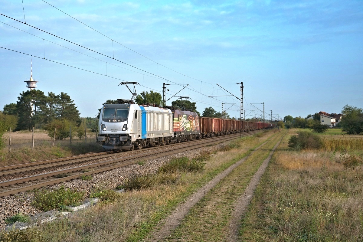 Dto. 187 536-8 am 18.10.2018 im Abendlicht bei Zeithain (DZN) als Tfzf mit 187 505-3 auf der