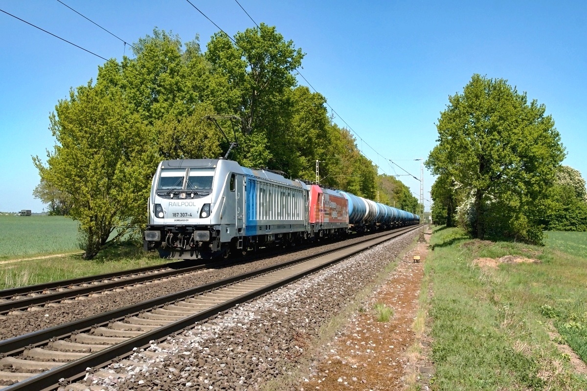 Dto. 187 307-4 am 07.05.2020 bei Wunstorf (HWUN) Liethe mit Wagenlok 186