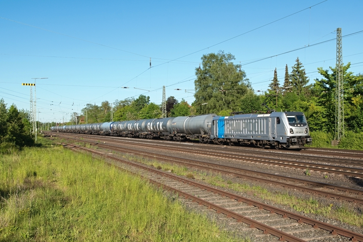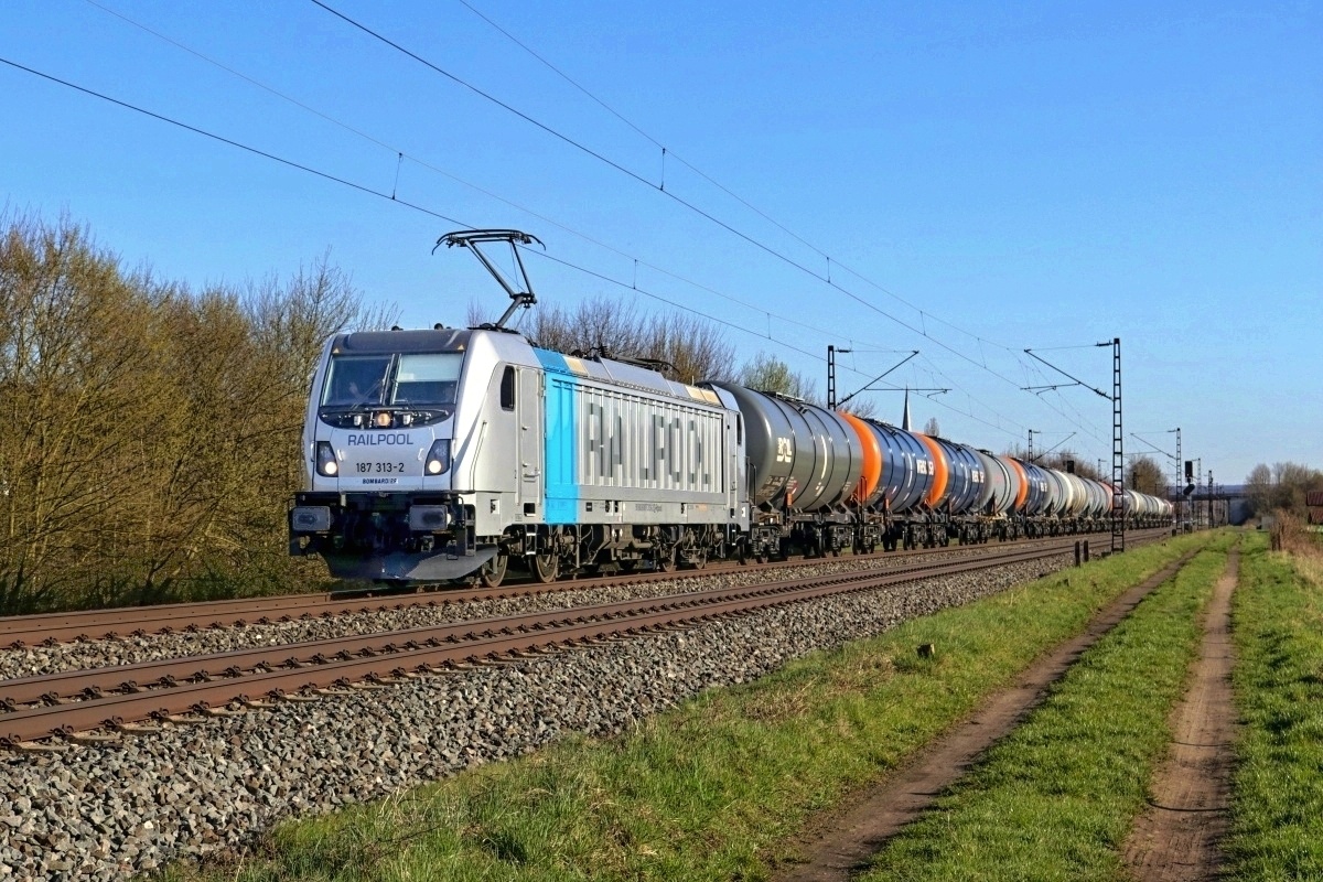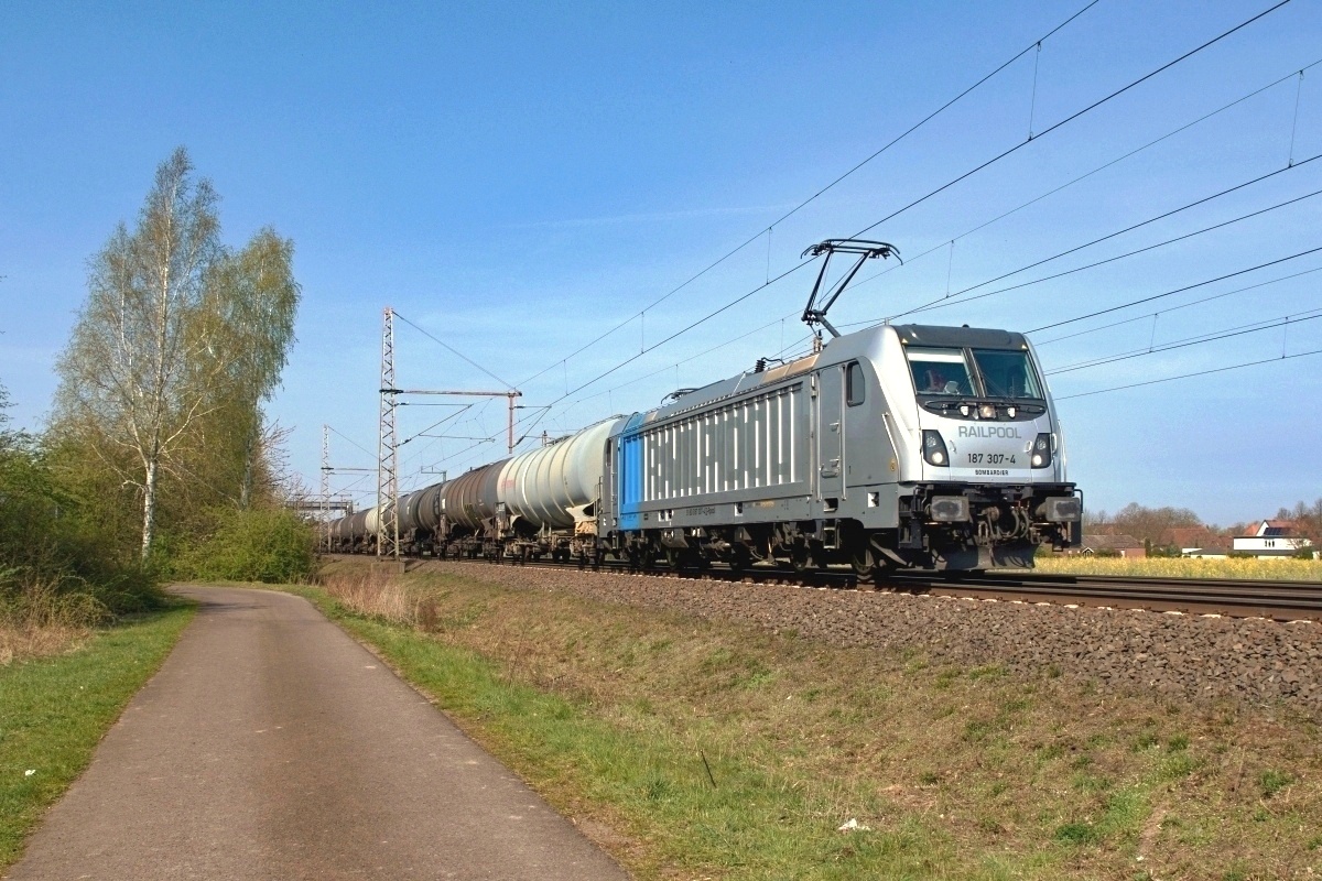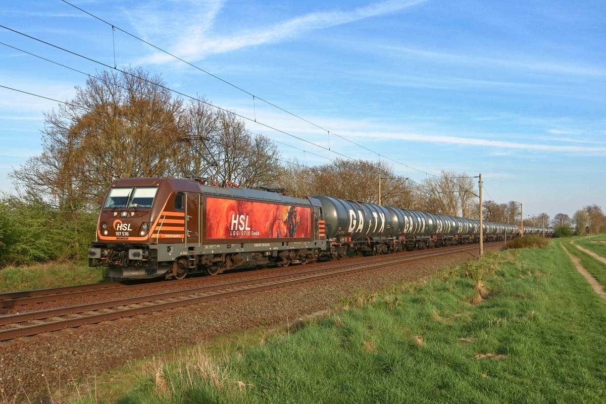 Dto. 187 536-8 am 17.04.2018. Hier passierte die Lok Woltorf mit GATX