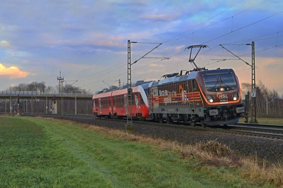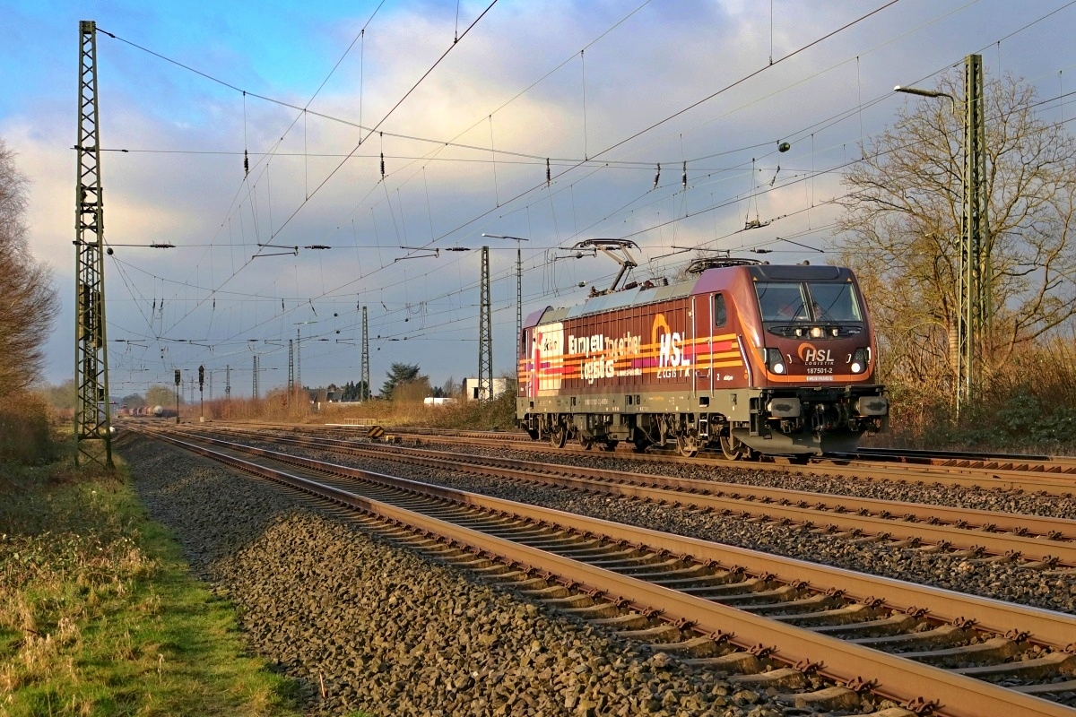 Dto. 187 501-2 am 01.02.2018 im letzten Tageslicht. Hier war die Lok bei Haste (HHAS) mit dem