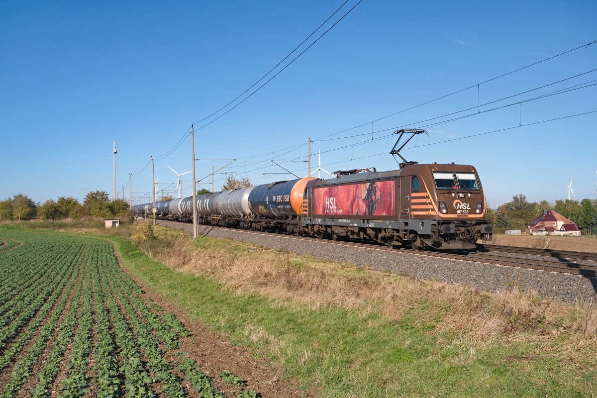 Dto. 187 536-8 am15.10.2024 bei Ovelgünne (LOV) mit einem Kesselwagenzug