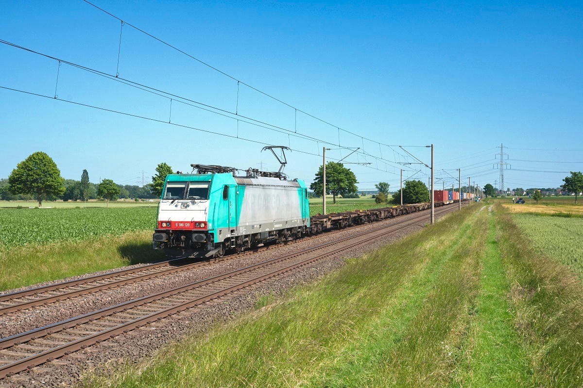 Dto. 186 128-5 am 12.06.2025 bei Vechelde (HVEC) Sierße mit einem CT-Zug