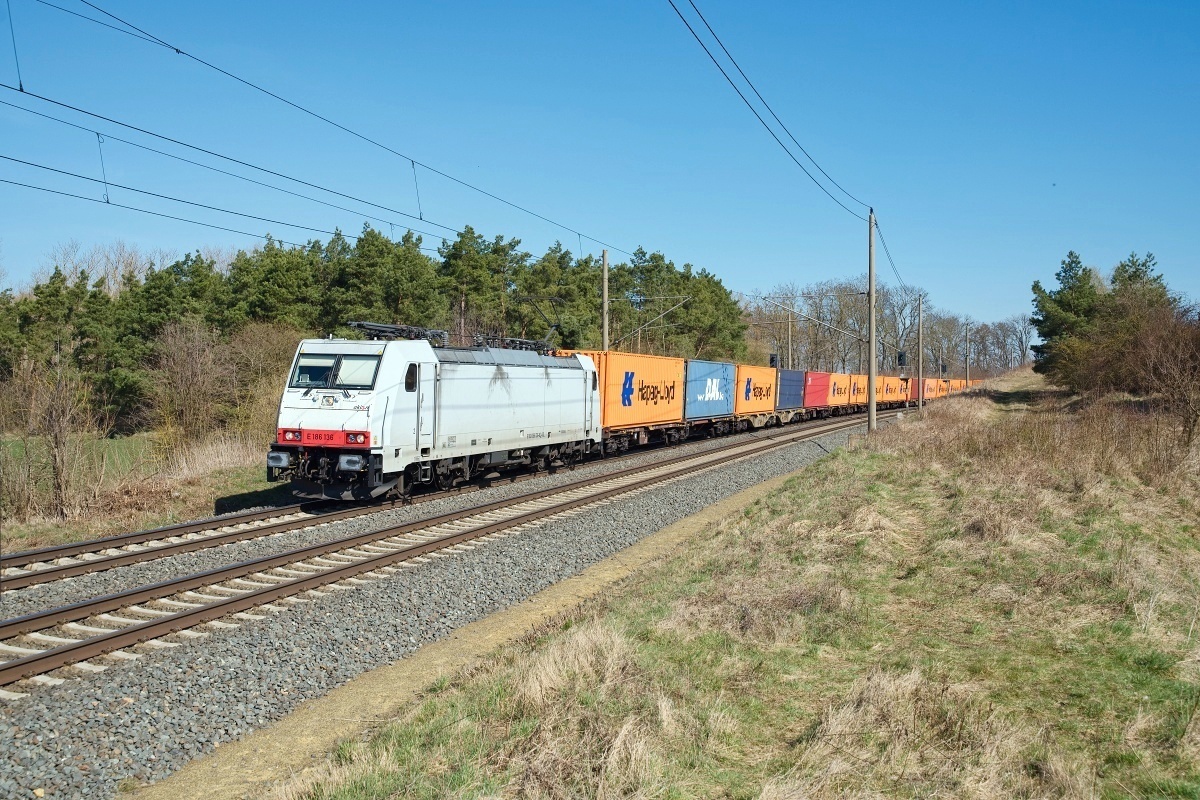 Dto. 186 136-8 am 20.03.2025 bei Ovelgünne (LOV) mit dem Containerzug DGS