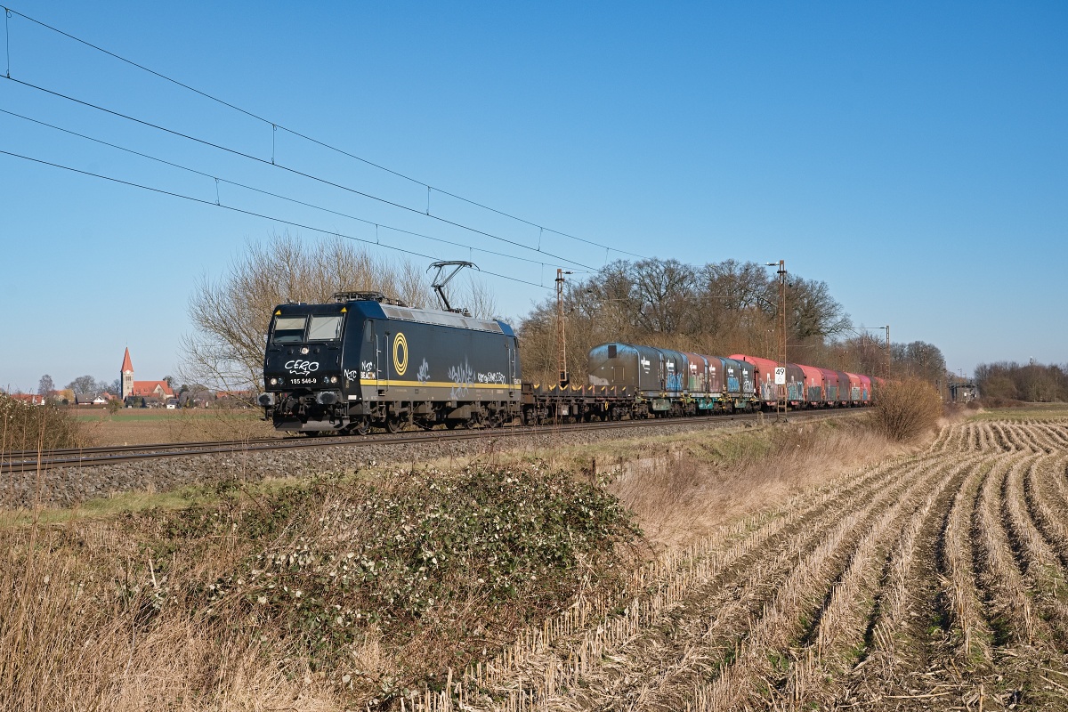Dto. 185 546-9 am 18.02.2024 mit Grafittis verunstaltet bei Kirchhorsten (HKHN) mit dem DGS 95545