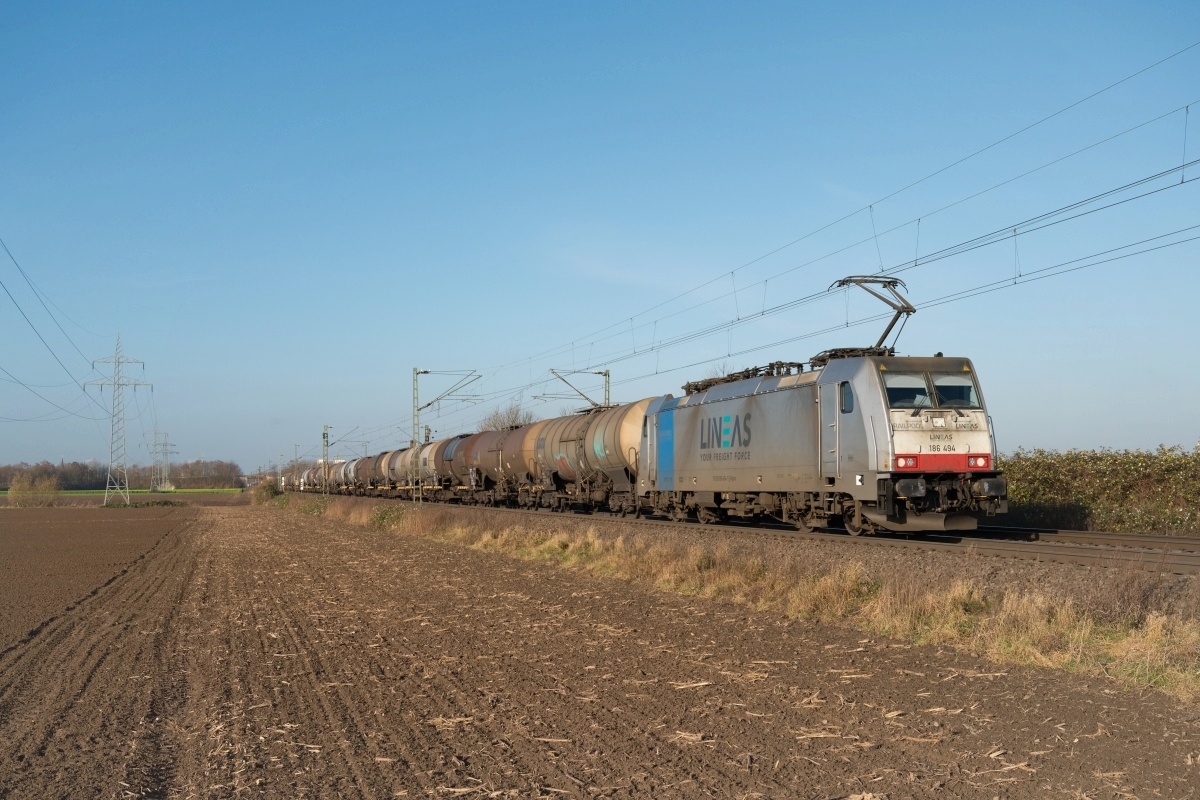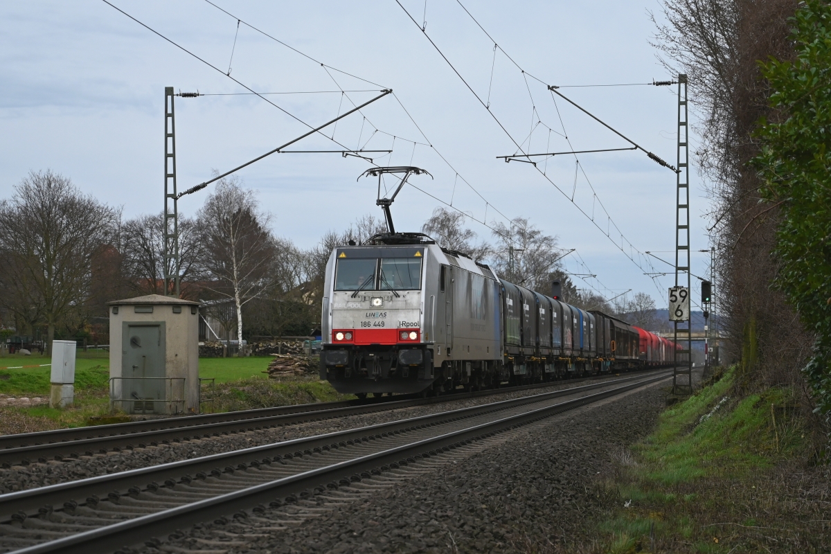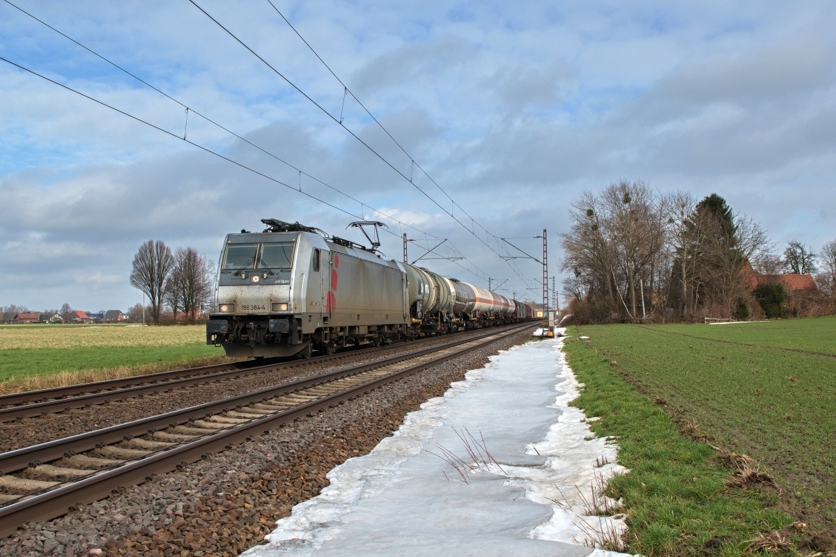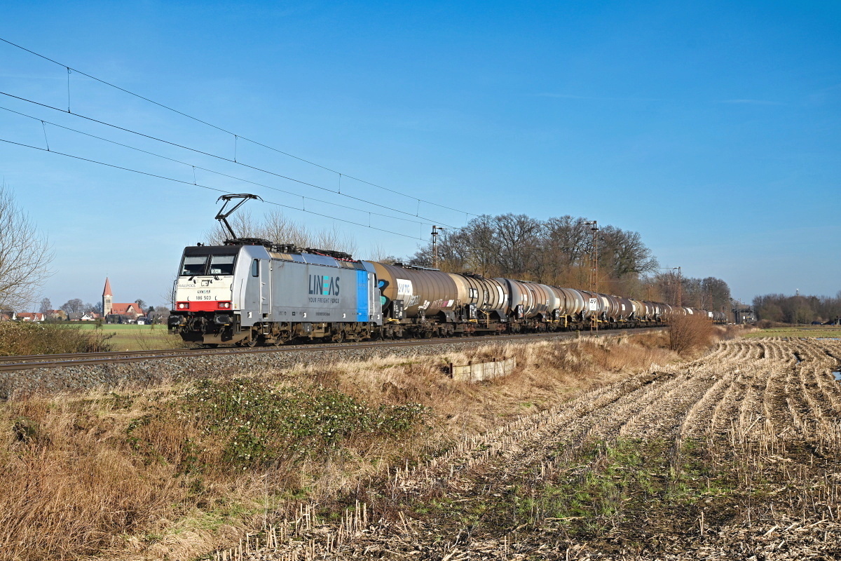 Dto. 186 503-9 am 27.01.2024 bei Kirchhorsten (HKHN) mit Kesselwagen Rtg.