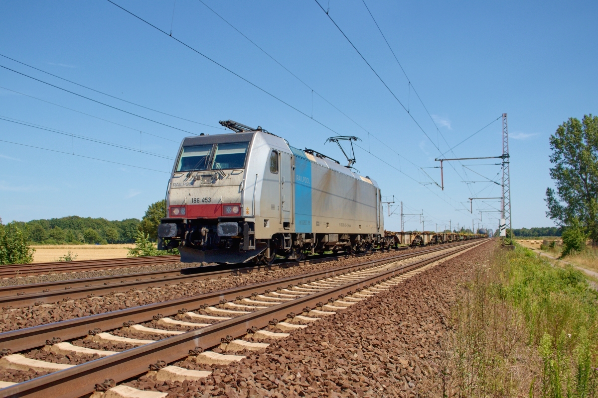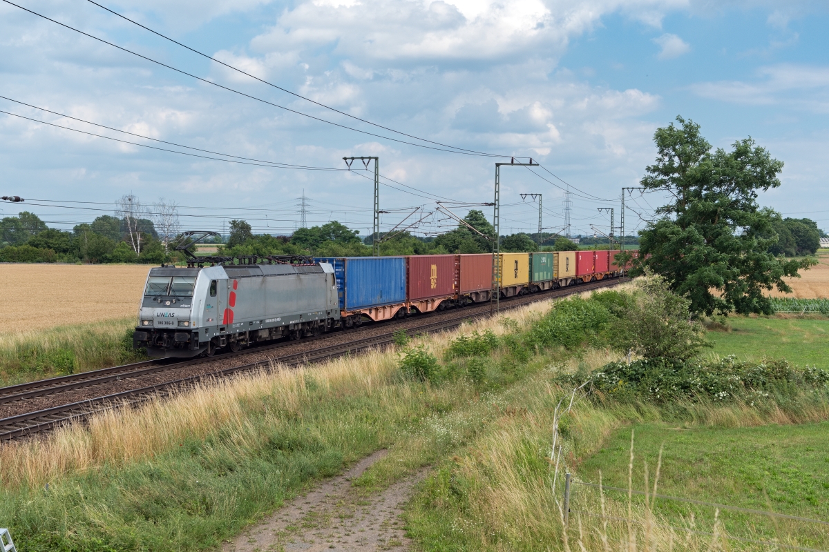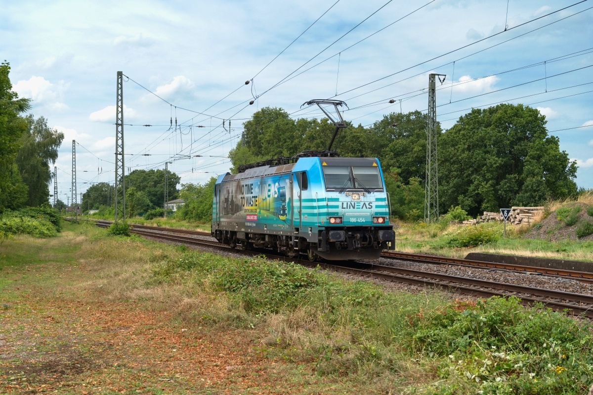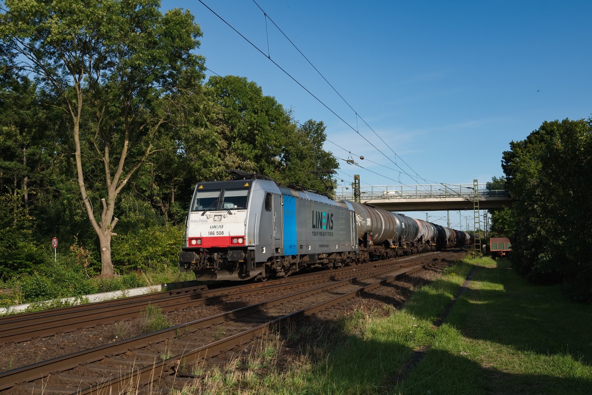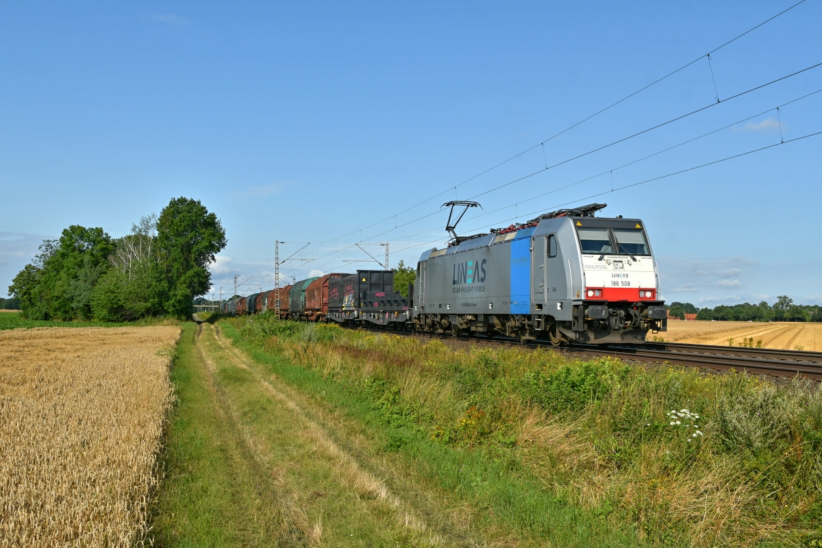 Dto. 186 508-8 am 07.08.2021 bei Lindhorst (HLH). Die Lok wurde