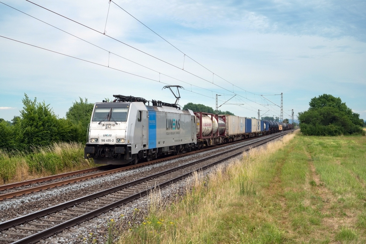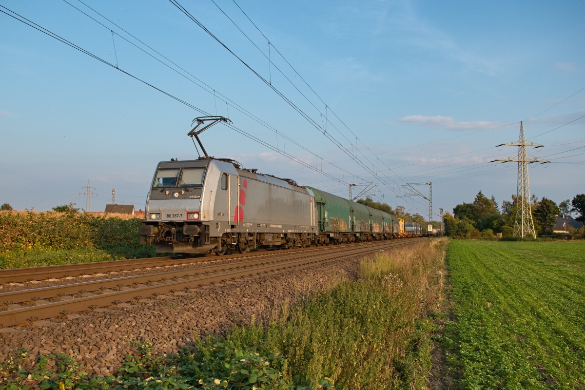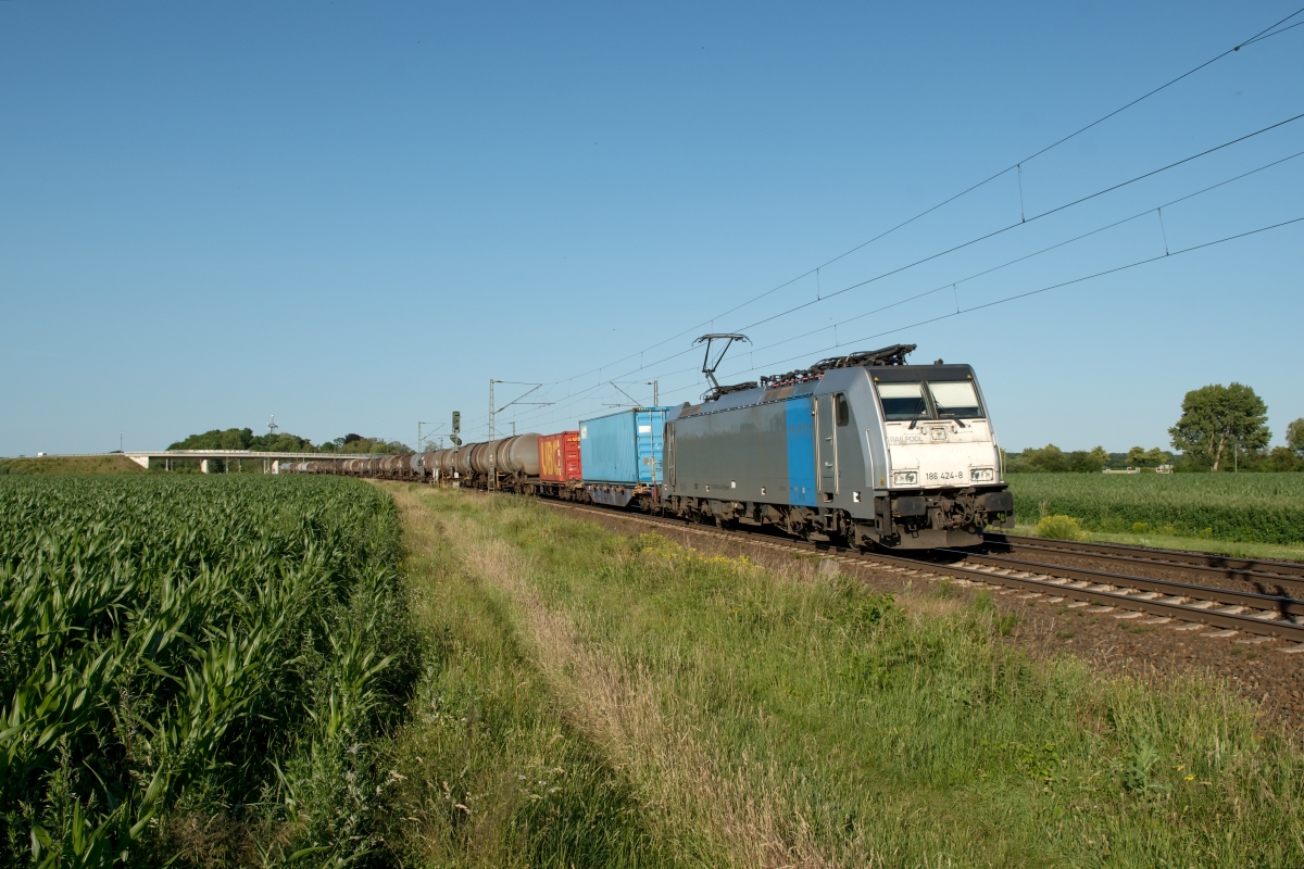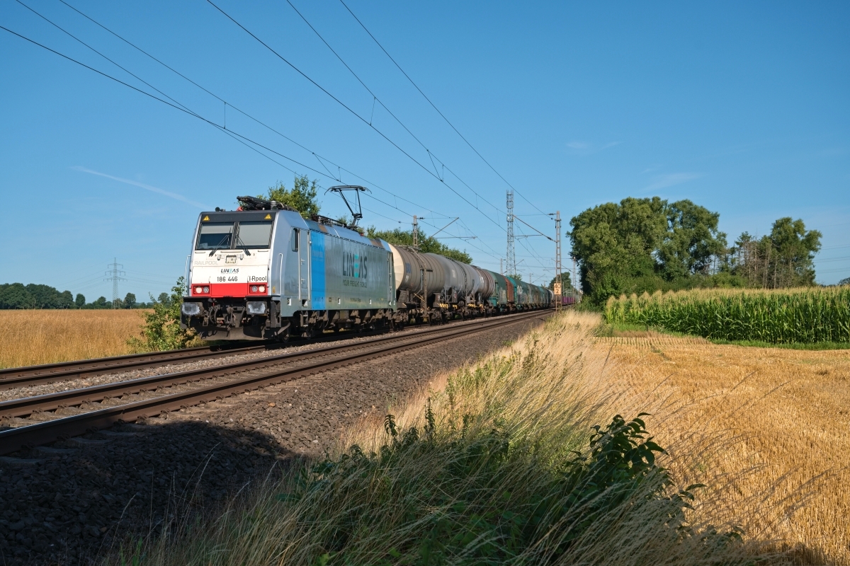 Dto. 186 508-8 am 18.07.2023 im Abendlicht. Hier passierte die Lok den