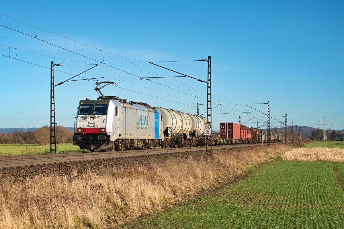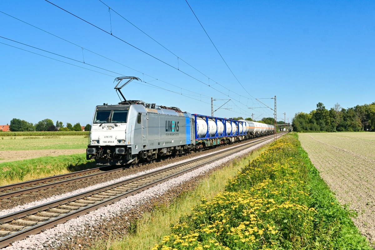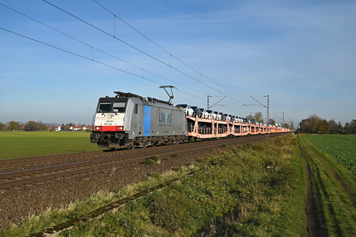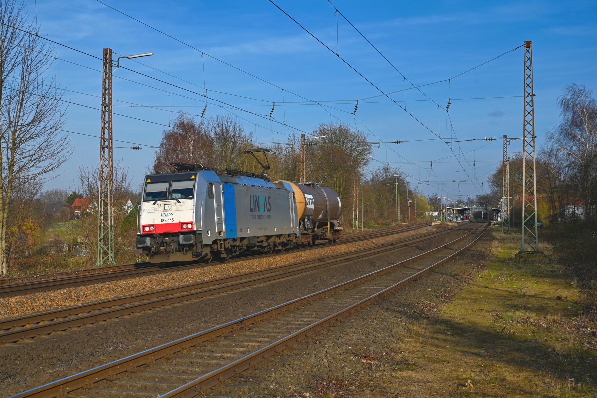 Dto. 186 502-1 am 18.10.2024 bei Ovelgünne (LOV) mit Kesselwagen Rtg.