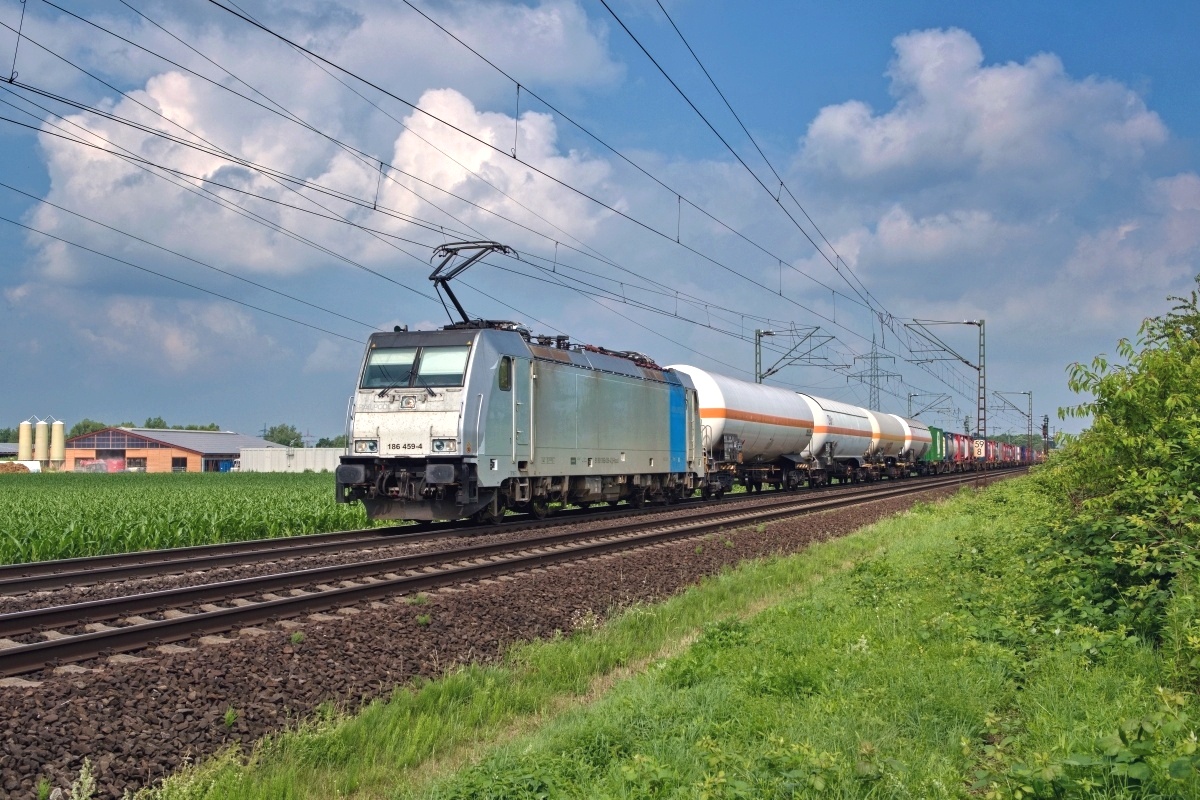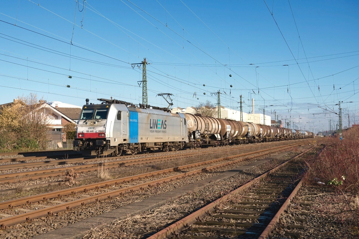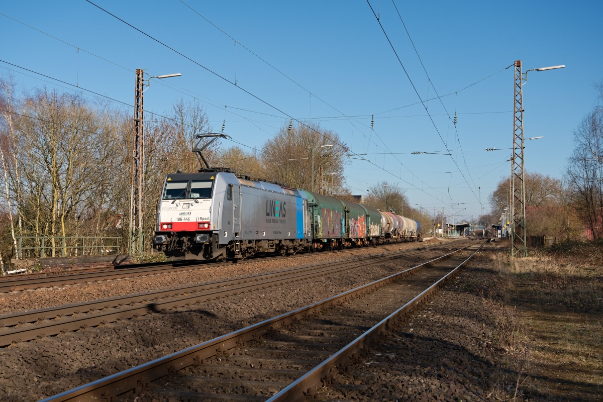 Dto. 186 448-7 am 01.02.2025 im Bf Oelde mit einem Kesselwagenzug Rtg.