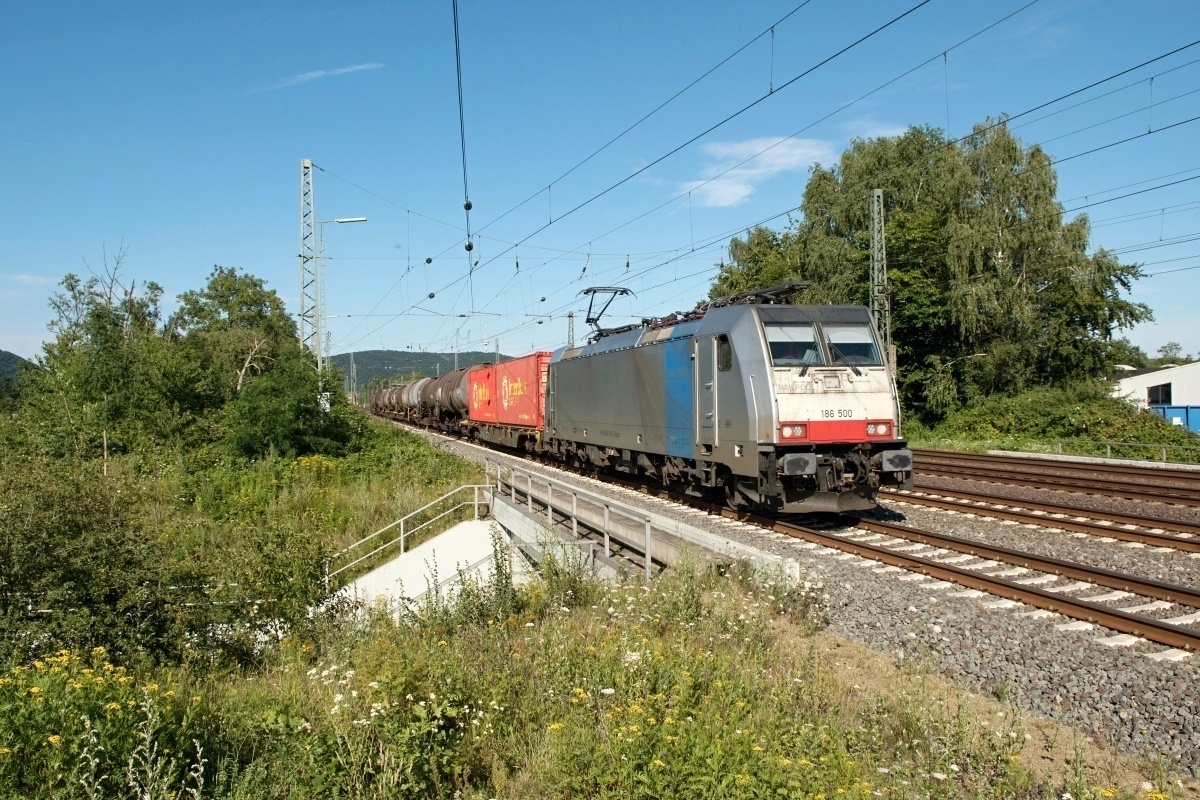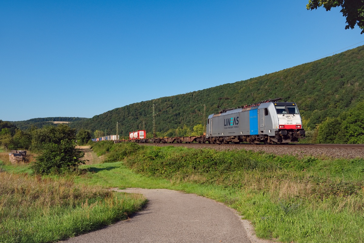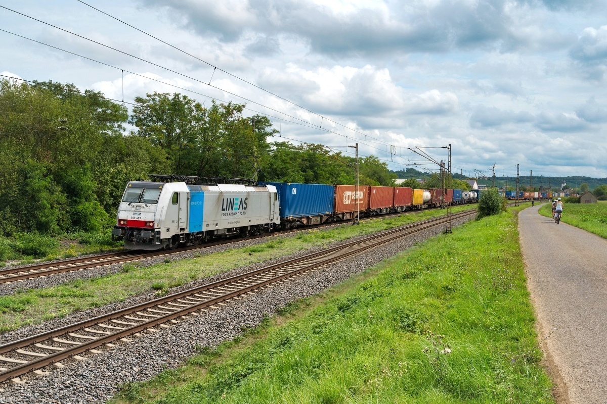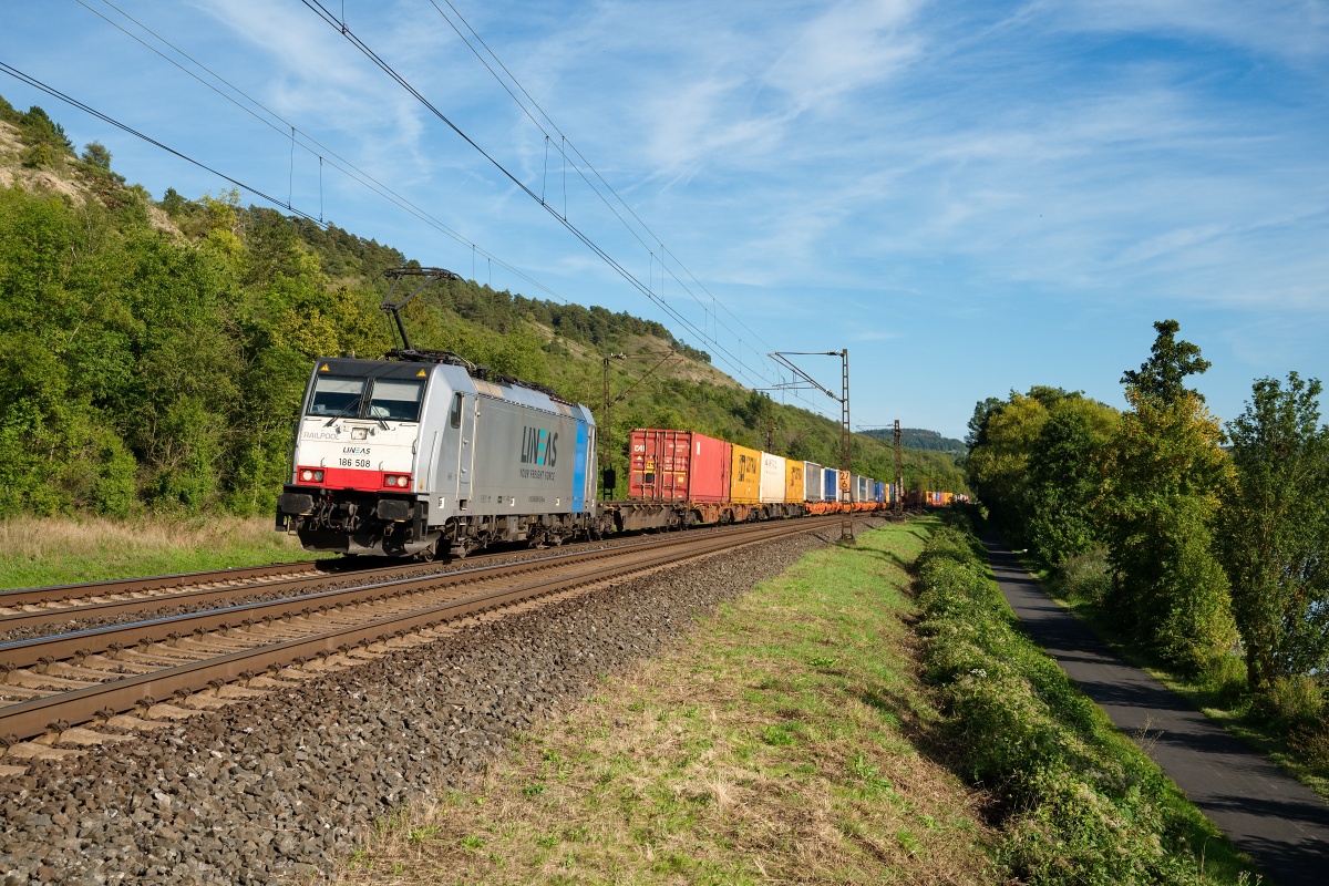 Dto. 186 508-8 am 11.08.2023 bei Gambach (Main) mit einem CT-Zug Rtg.