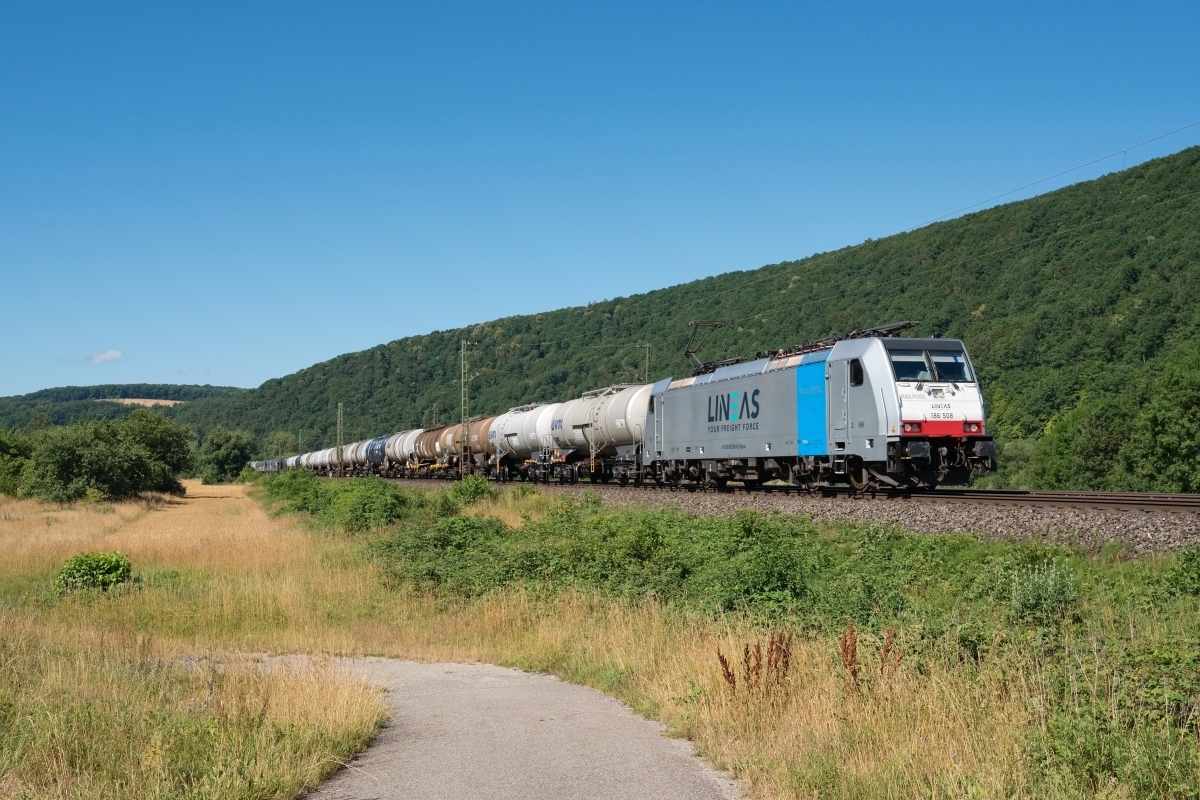 am 02.07.2022 bei Wernfeld (NWFD) im Maintal mit einem Kesselwagenzug