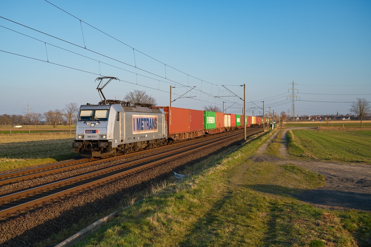 Dto. 386 011-1 spät nachmittags am 21.03.2025 bei Vechelde (HVE) Sierße mit