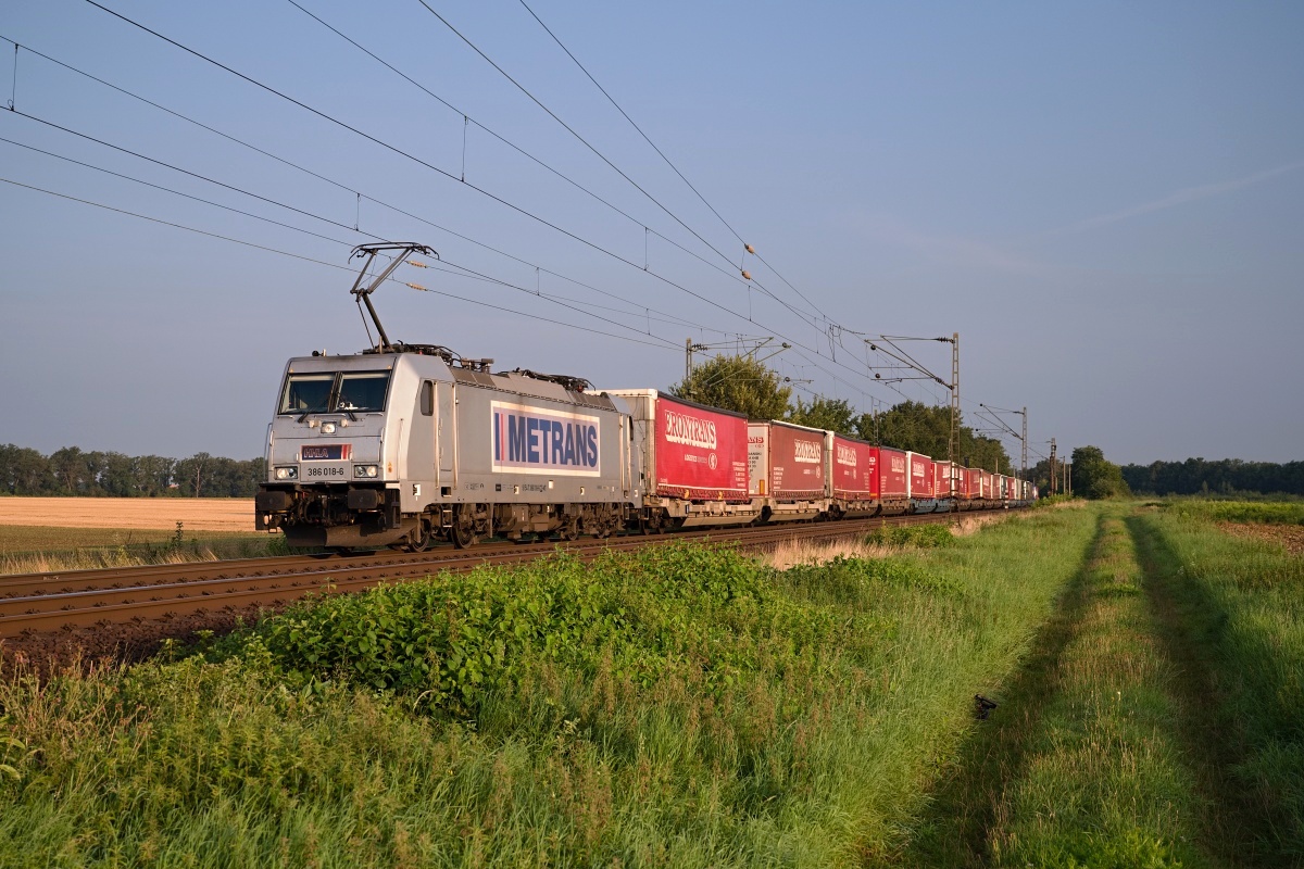 Dto. 386 018-6 kurz nach Sonnenaufgang am 20.08.2024 mit dem Erontrans-KLV