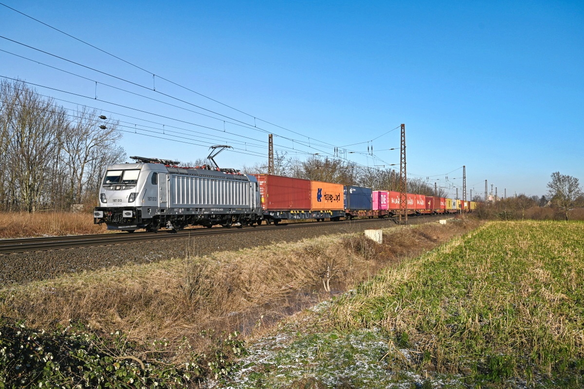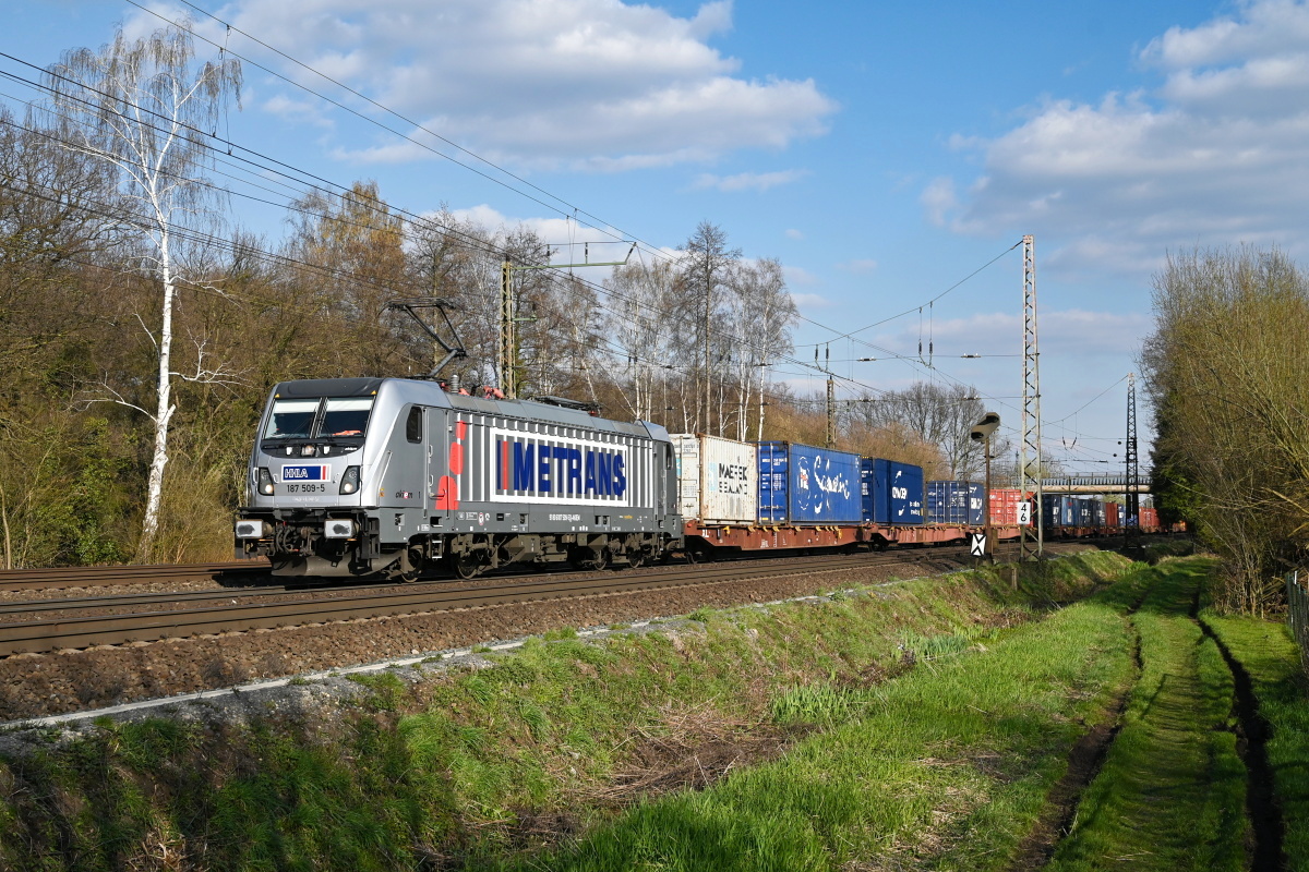 to. 187 509-5 am 05.04.2023 im Gümmer Wald(HGUE) mit einem Containerzug Rtg.