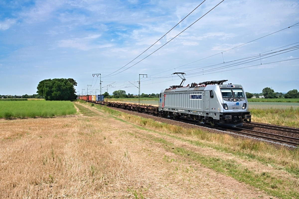 Dto. 187 014-6 am 19.07.2024 bei Klein-Gerau mit einem teilbeladenen CT-Zug
