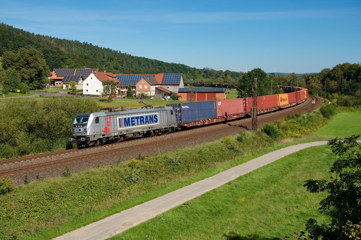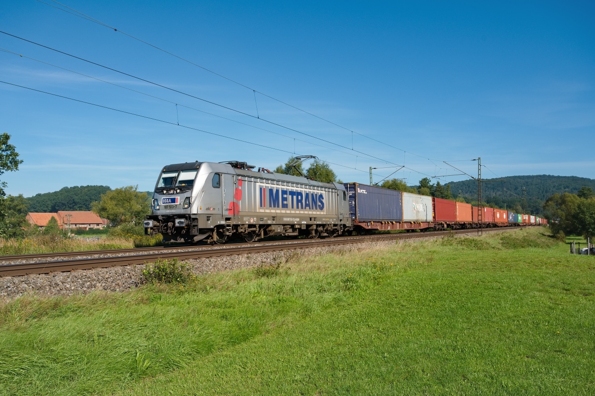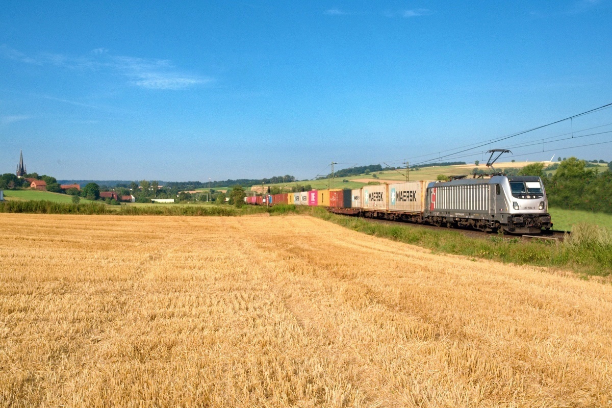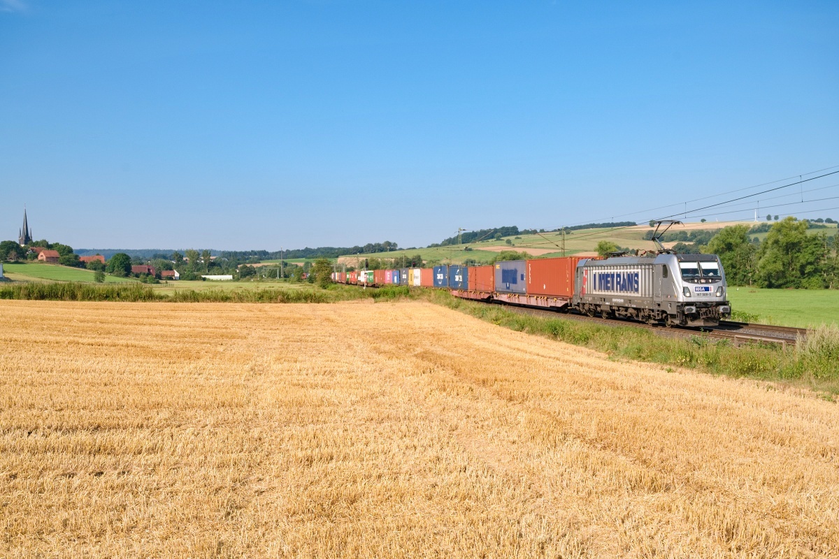 Dto. 187 511-1 am 23.08.2022 bei Linsburg (HLBU) mit einem Containerzug Rtg.