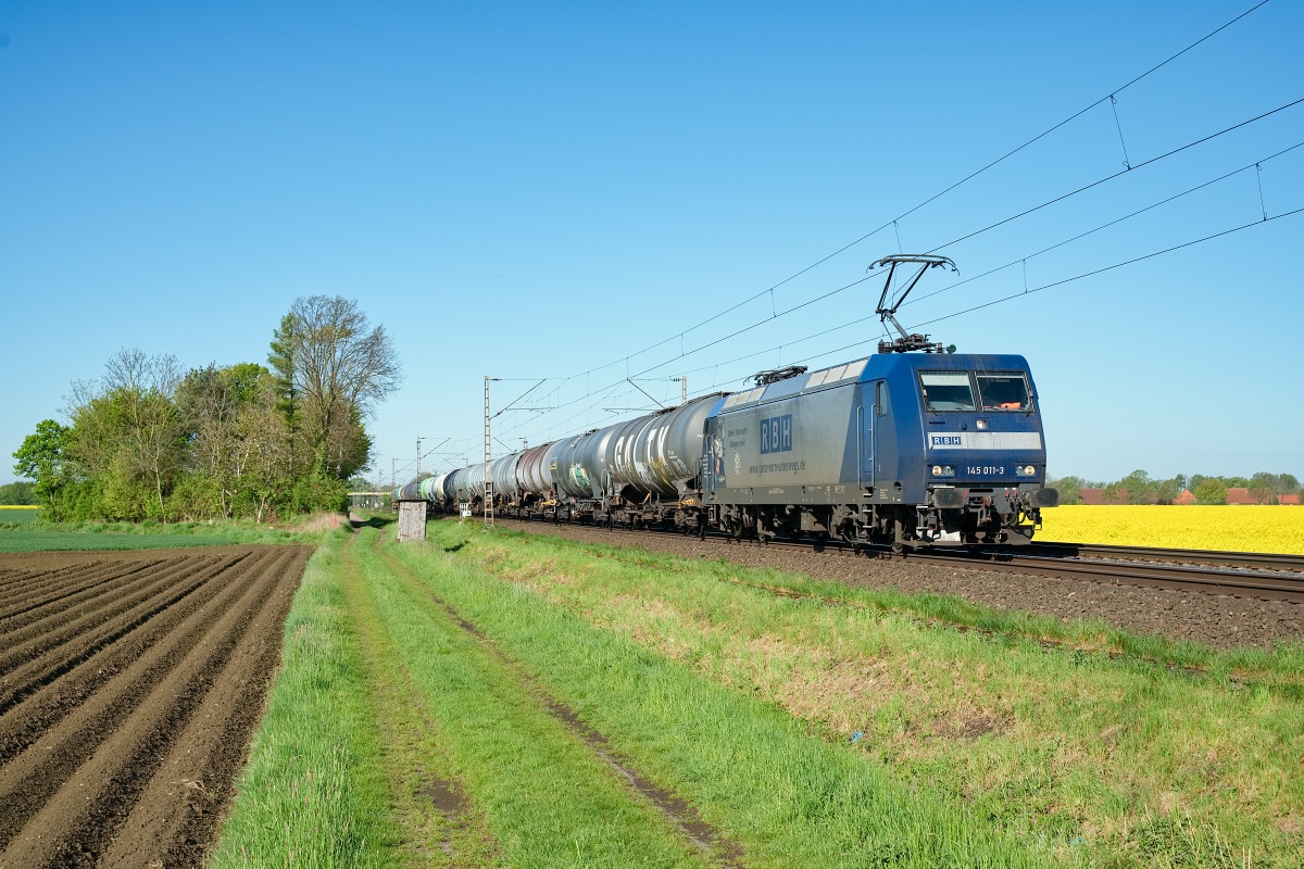 Dto. 145 011-3 am 26.04.2025 bei Lindhorst (HLH) mit Kesselwagen Rtg.
