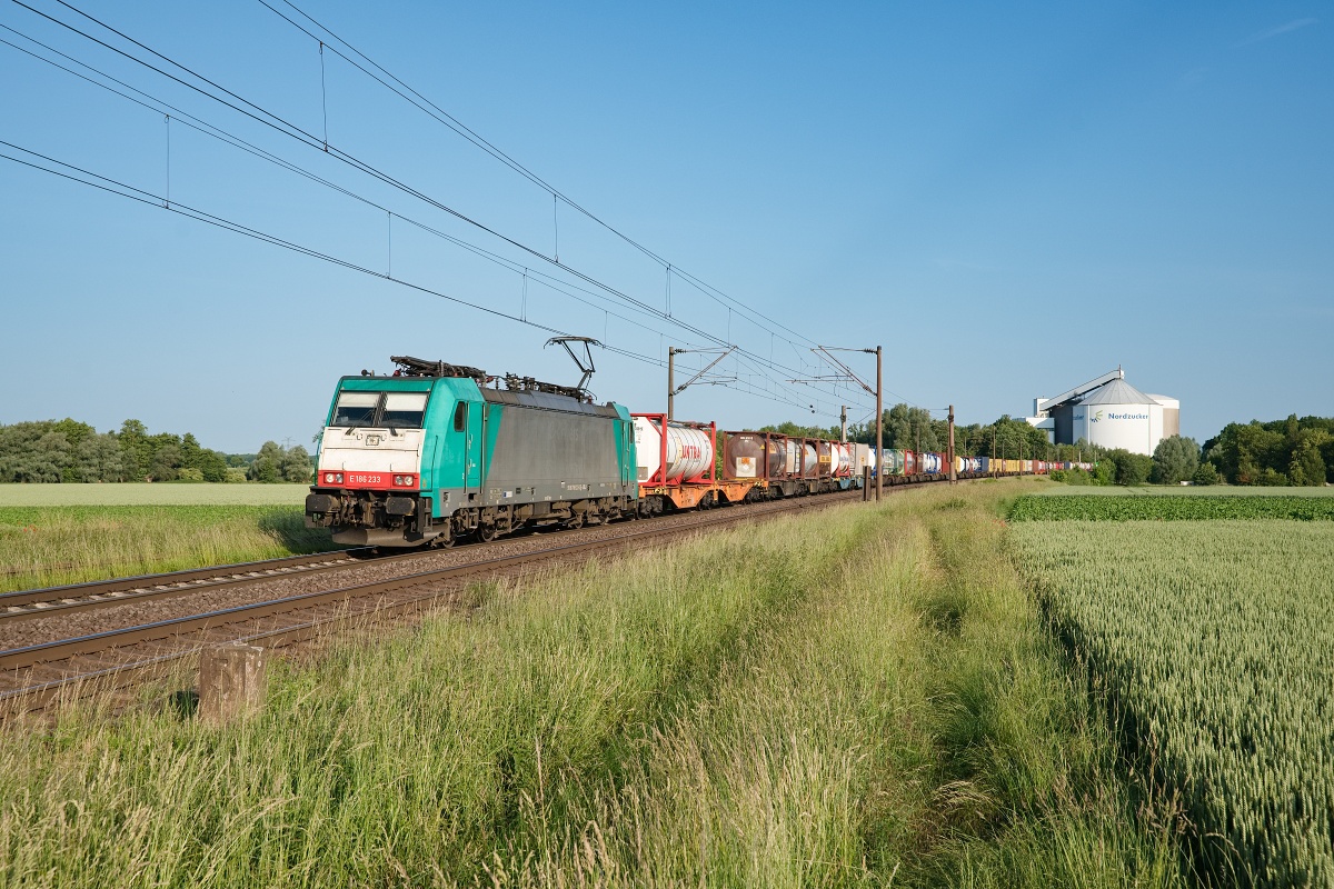 Dto. 186 233-3 am 06.08.2024 bei Schandelah (HSDL) mit einem Falns Ganzzug