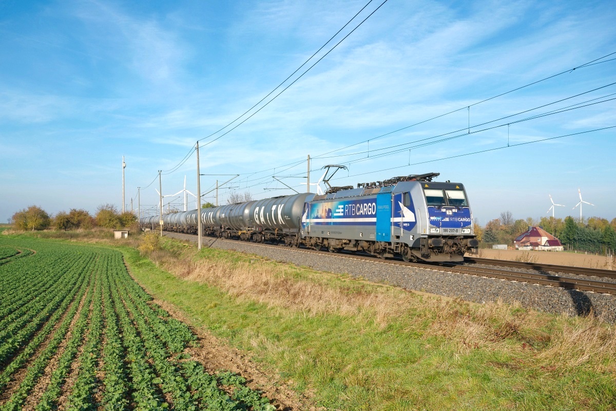 Dto. 186 297-0 am 26.10.2024 bei Ovelgünne (LOV) mit einem Kesselwagenzug