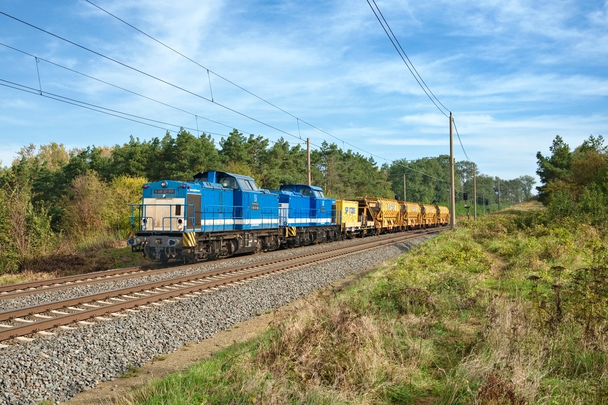 99 80 9121 006-7) mit der Schnellschotterplaniermaschine (D-SPAG 99