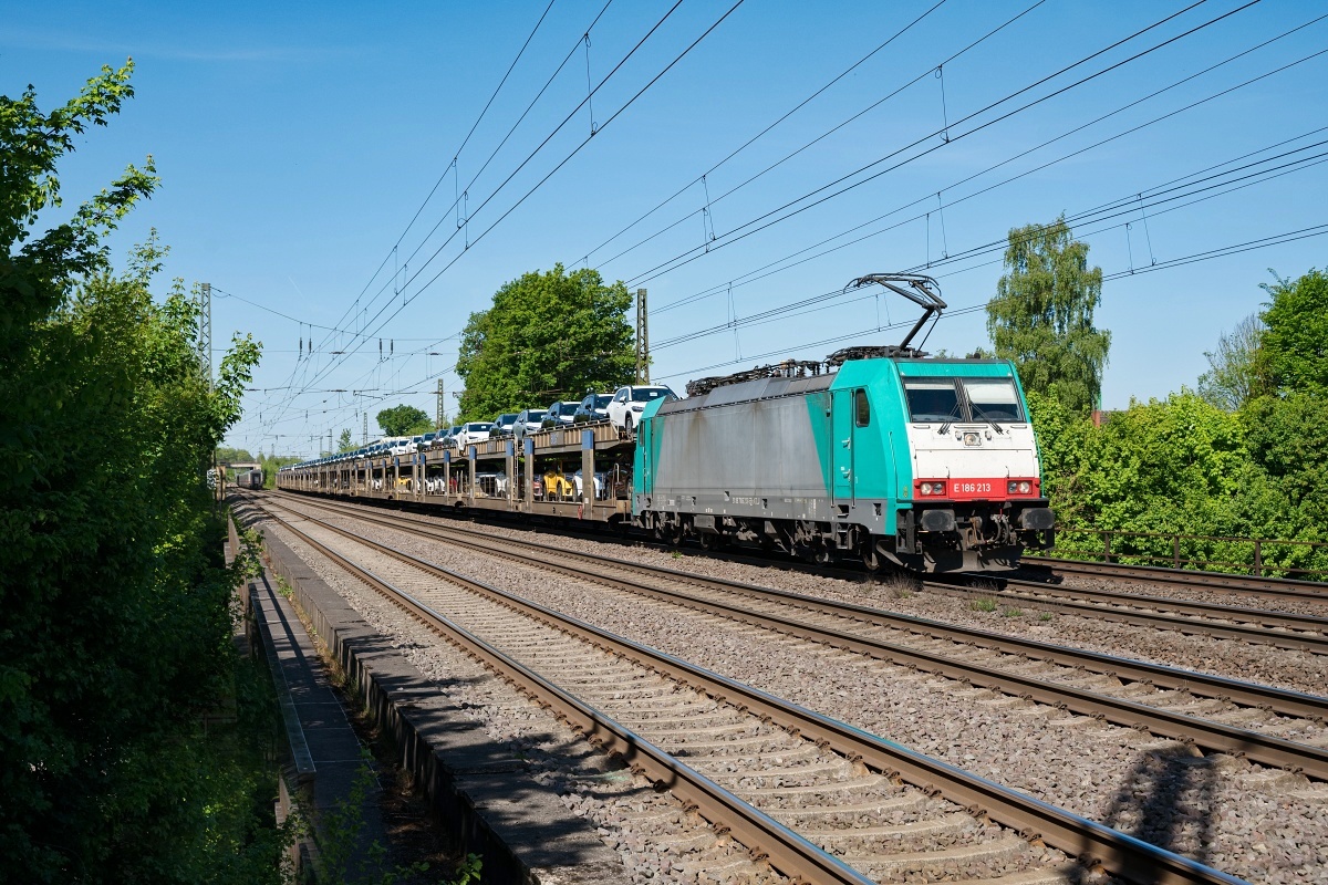 Dto. 186 213-5 am 10.05.2025 bei Gohfeld (HGOF) mit einem Voll-BLG Autozug