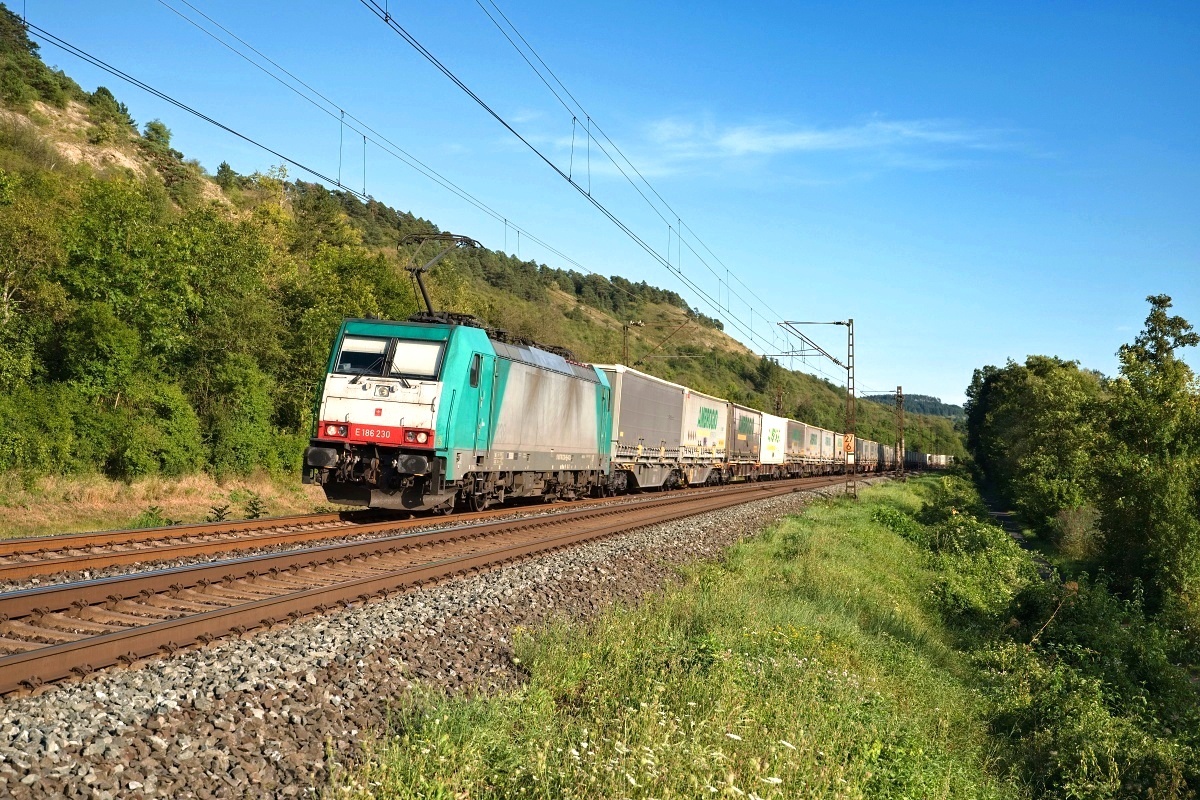 hier am 21.06.2022 bei Gambach im Maintal mit einem KLV Rtg. Norden/Gemünden