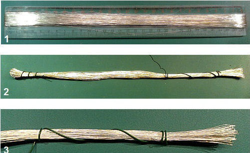Bild 1) Hier sieht man ein Bündel aus ca. 240x 0,3mm Silberdrähten. Um zu so einem