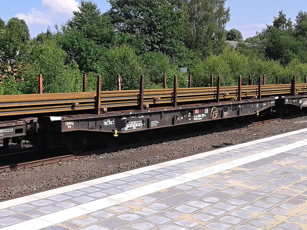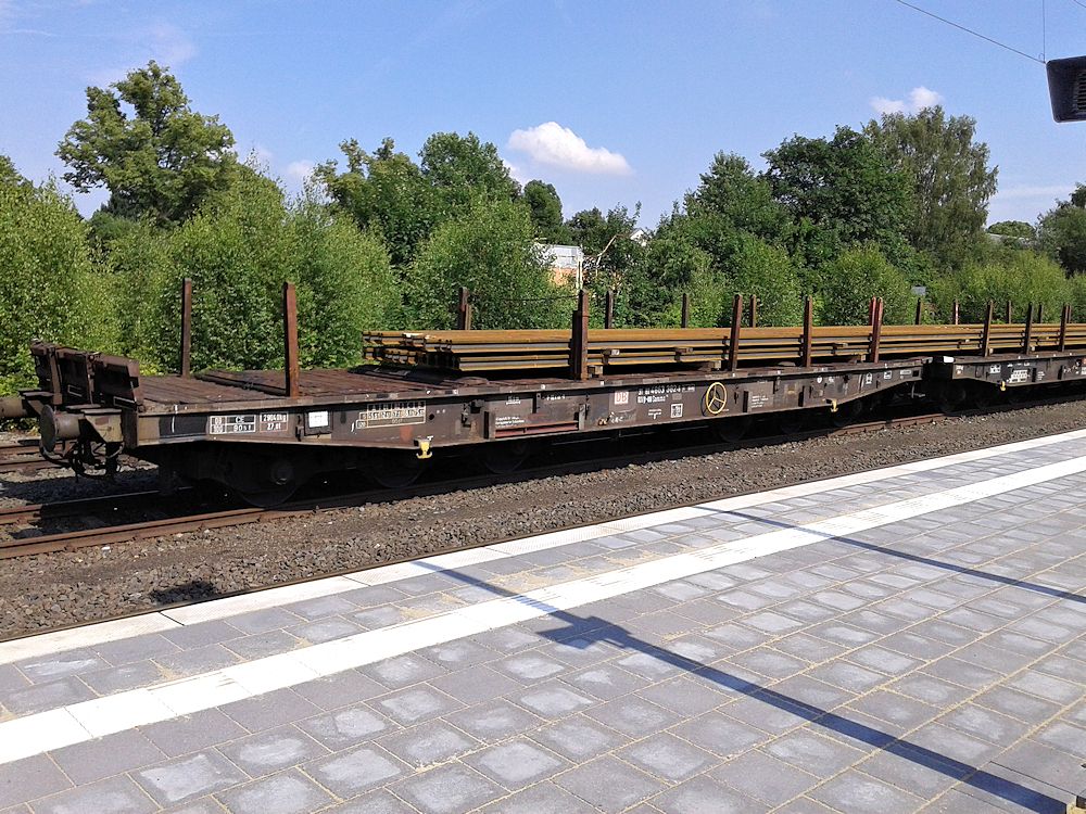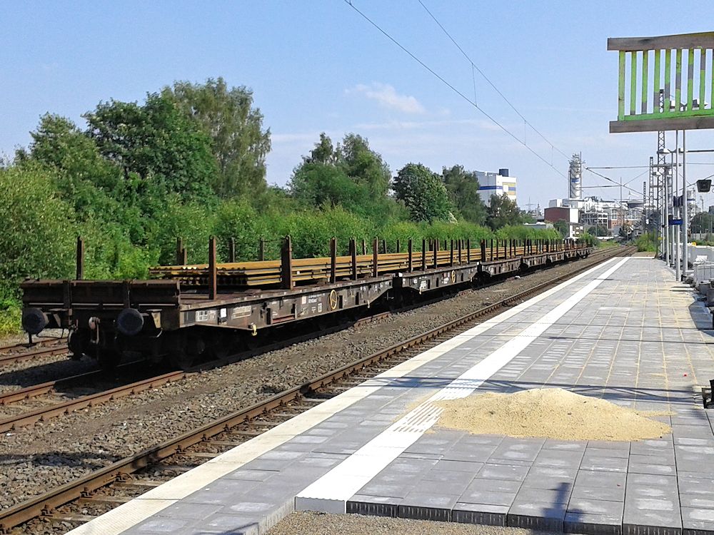 18.07.2015 - Ein Reihe mit Gleissträngen beladene DB AG Samms im Bahnhof Lage/Lippe zur weiteren Verwendung abgestellt