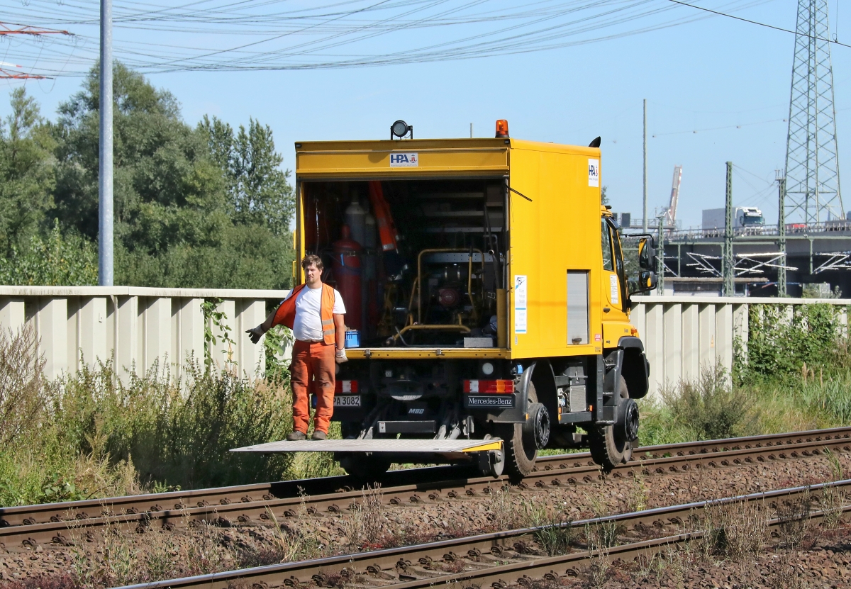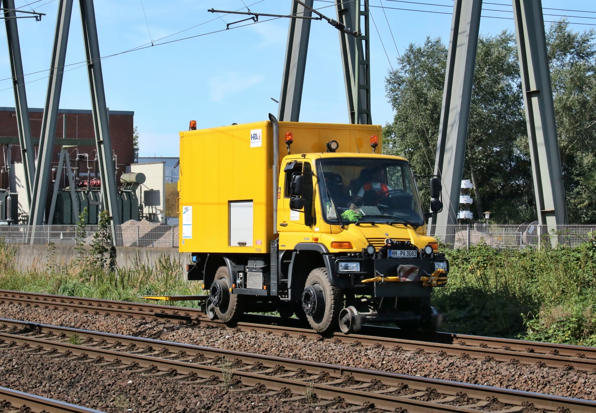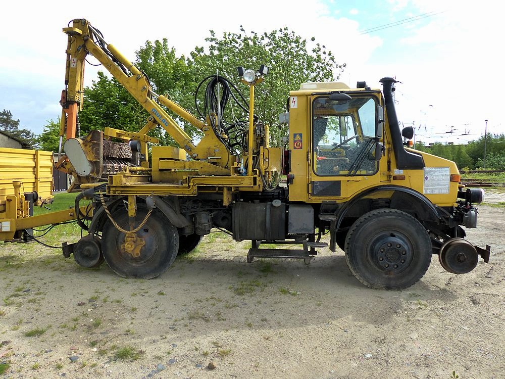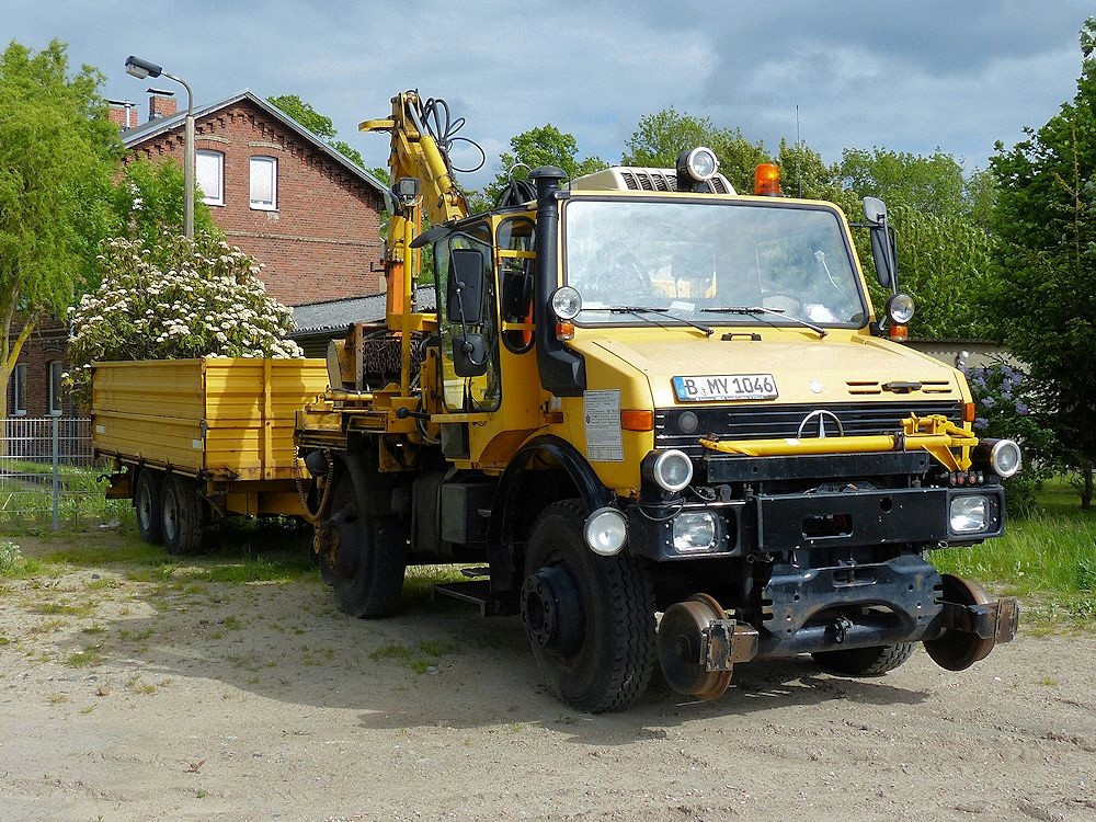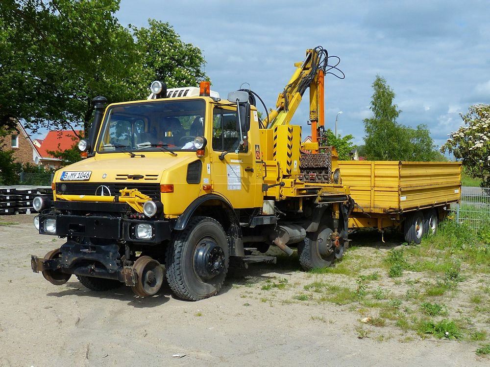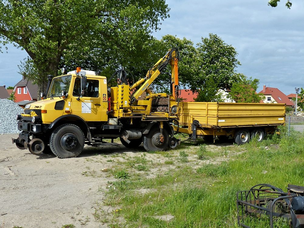 Beutlhauser Zweiwege Mercedes Benz Unimog mit Anhänger in Stralsund Hbf