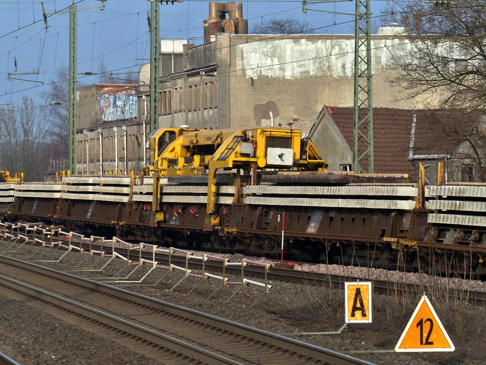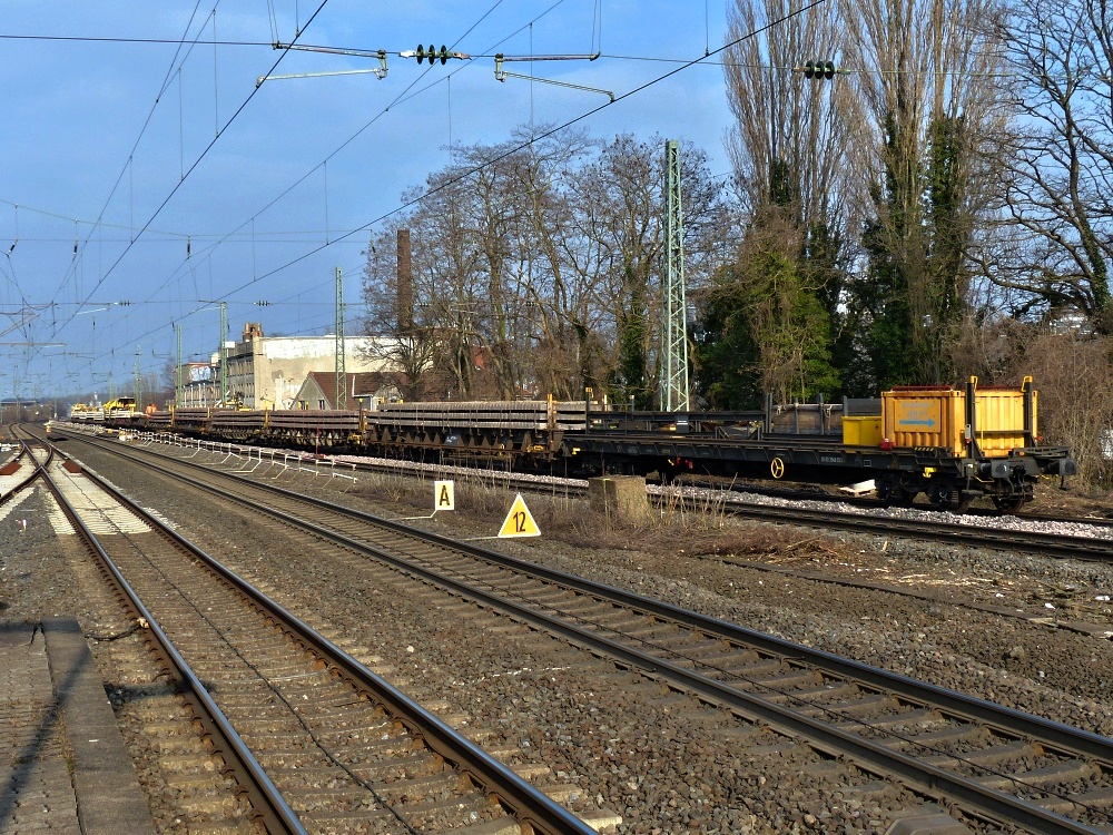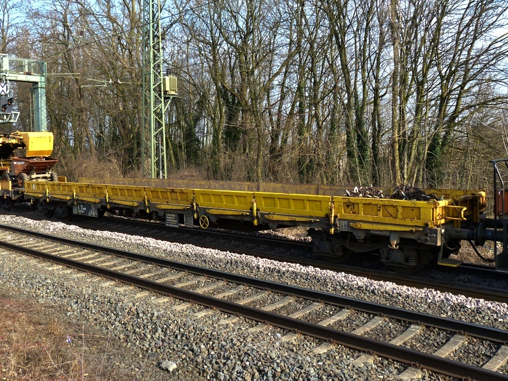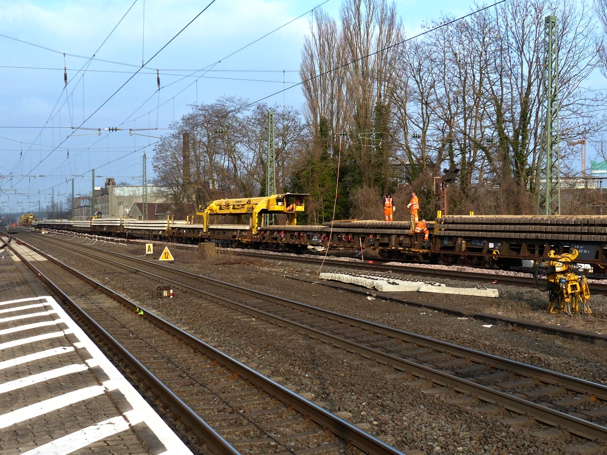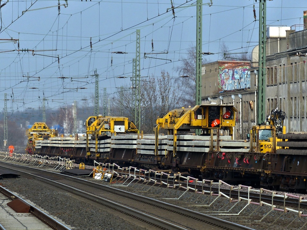 Die Oberbaustoffwagen auf denen die Schwellen transportiert werden sind vom